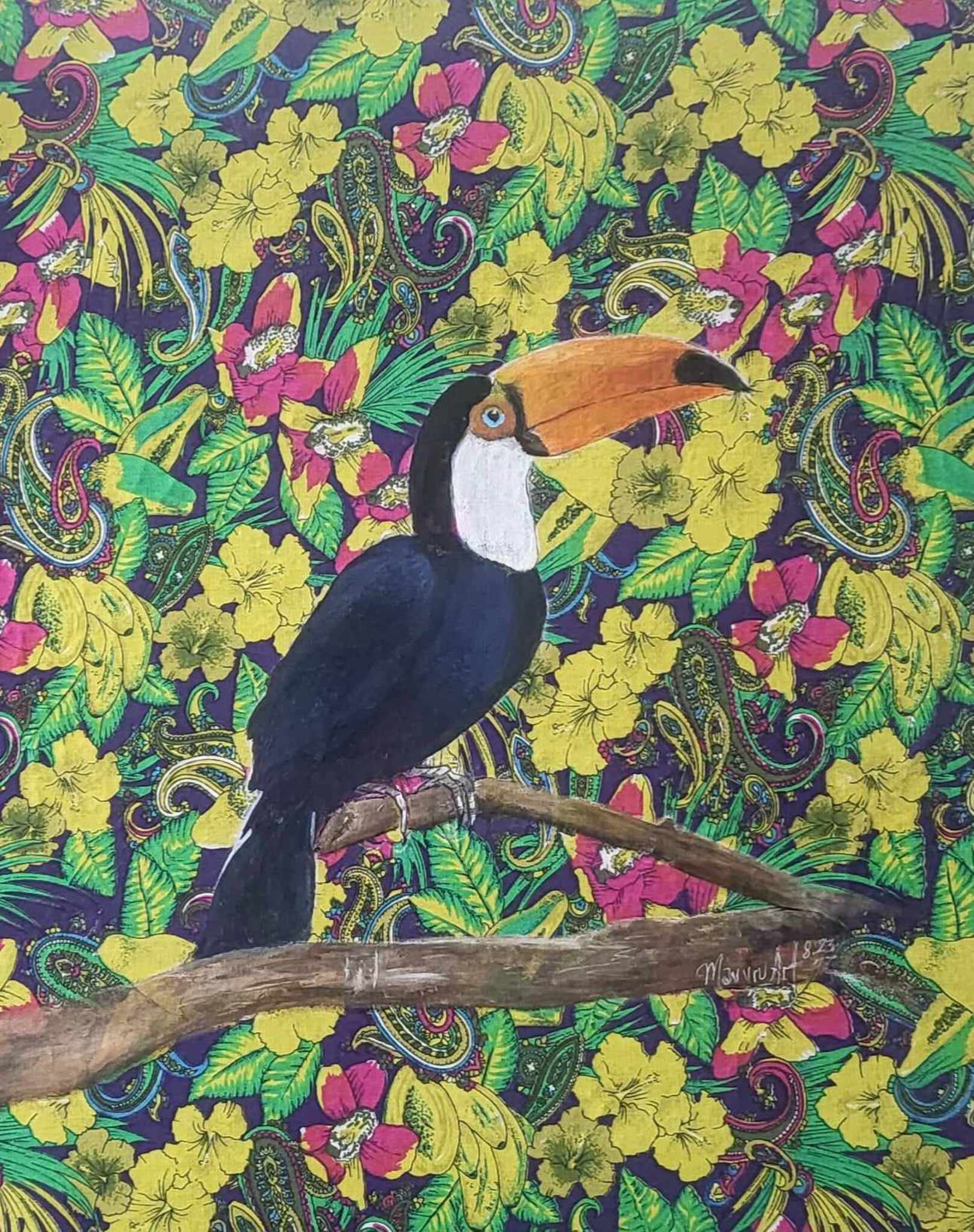 De volgende uit een serietje mix media. Het leuke is het ontwerp te combineren met de achtergrond. De toekan is in acryl, de achtergrond is stof. Dan krijg je een leuk effect.