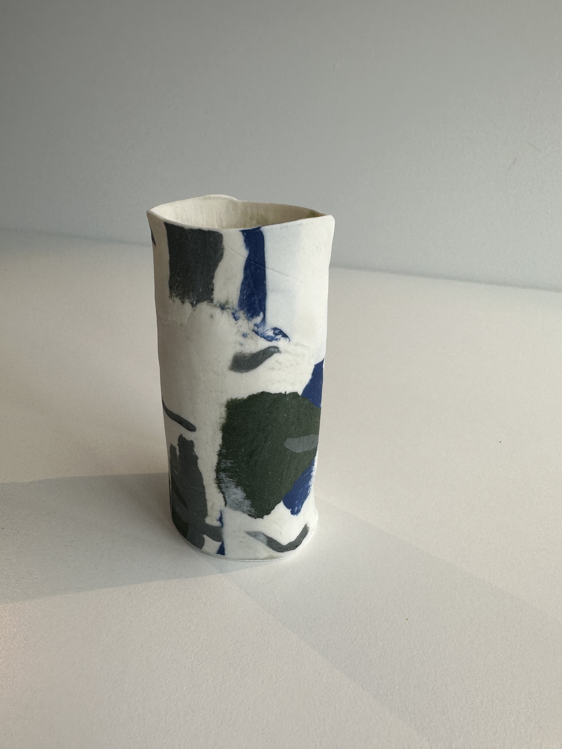 kleine porseleinen "vaas" met groene en blauwe decoratie