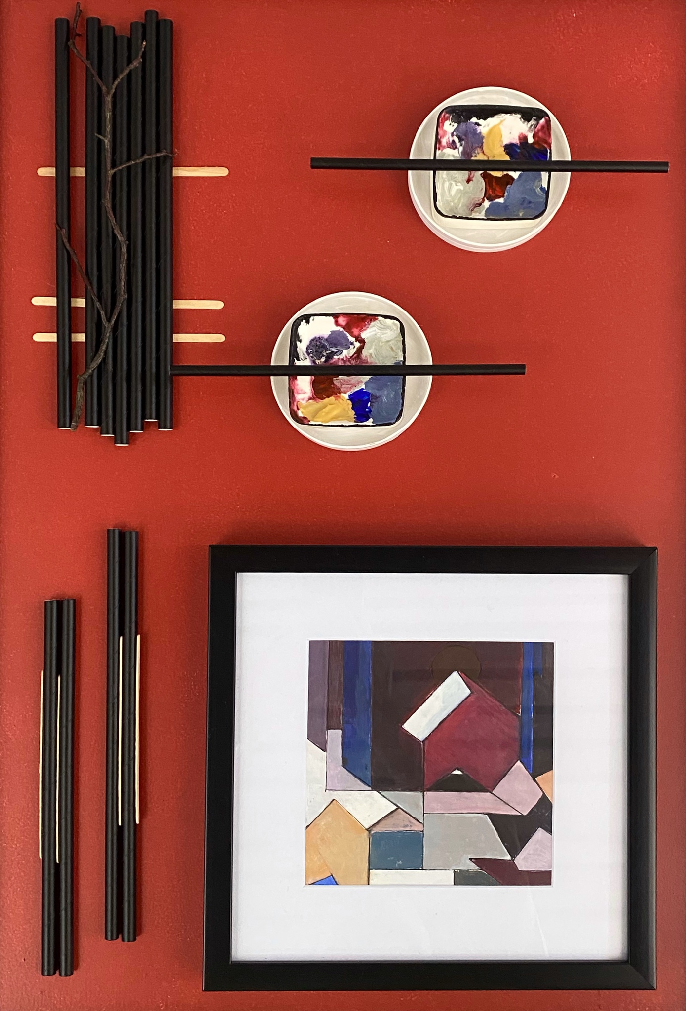 Op MDF plaat bevestigde 3D compostie van verschillende materialen incl. moderne weergave van een 17e eeuws klassiek schilderij. Geleverd in een zwarte omlijsting. Beschikbaar