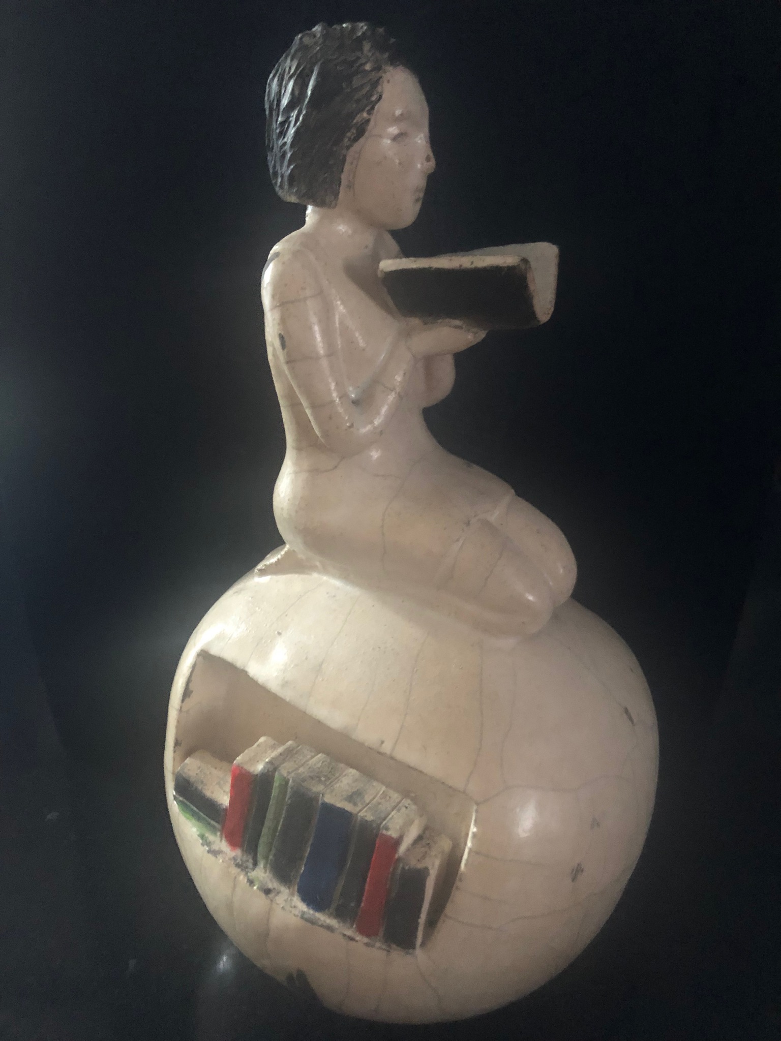 Zwartwit raku gestookte bol van keramiek met erop een lezend meisje en boekenkasten aan de zijkanten.