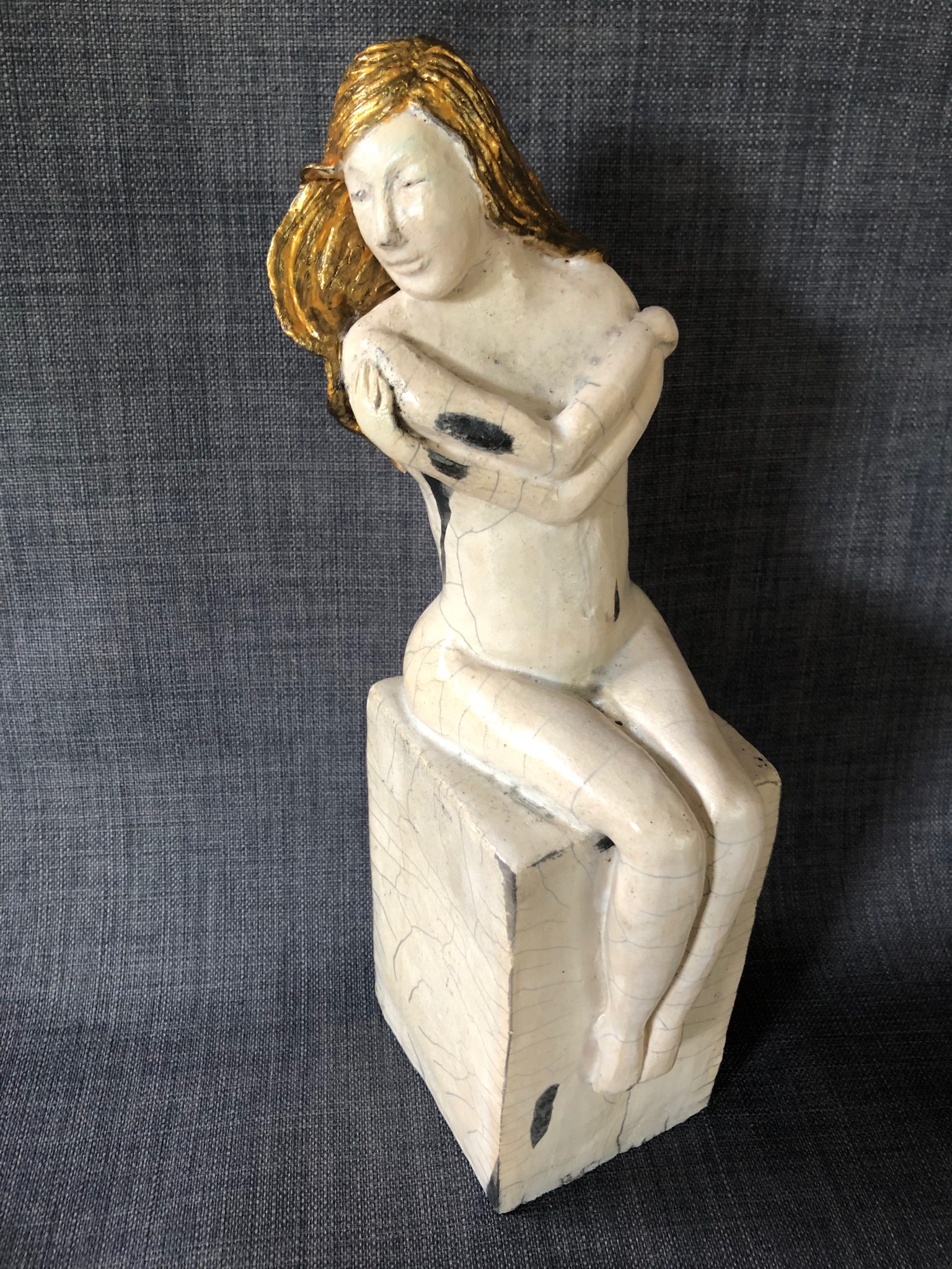 Zwartwit raku gestookt vrouwenbeeld van keramiek met goudkleurig haar.