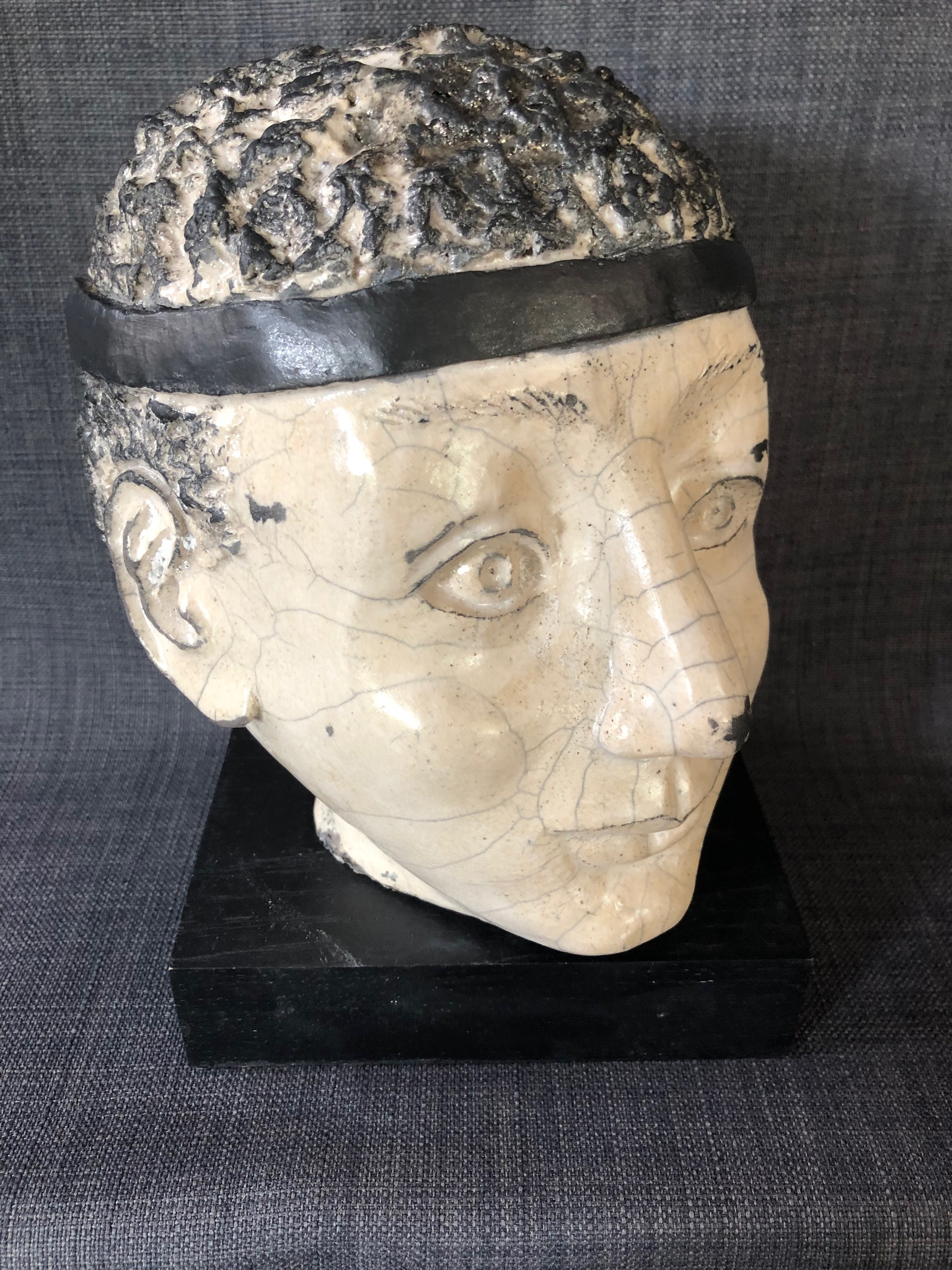 Mannenkop van zwartwit raku gestookte keramiek met masker op zwarte sokkel.