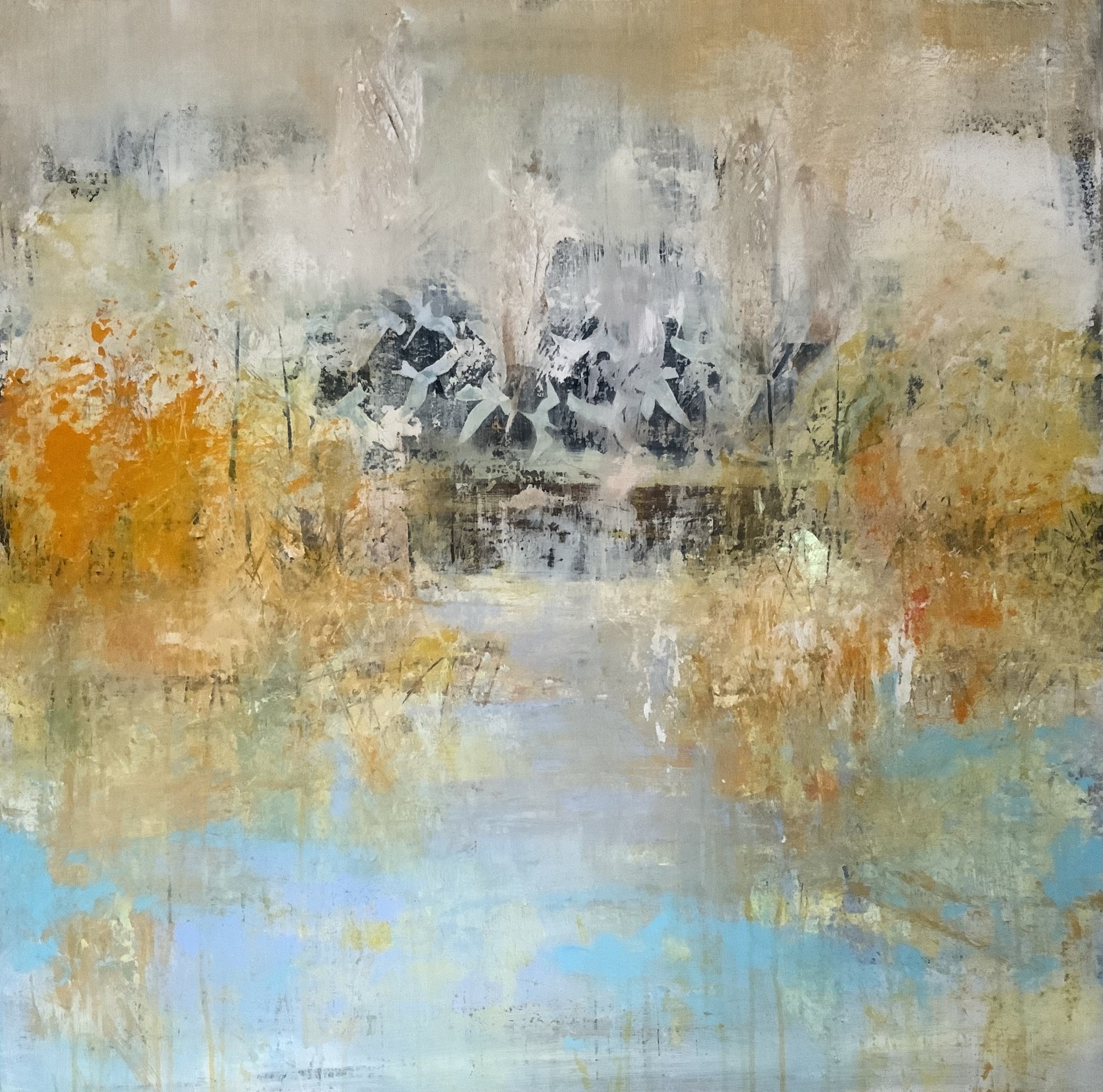 I see an abstract painting but I can see a landscape too. Nature with birds, water and clouds. but it's not what you look at that matters it's what YOU see. ready to hang, signed on the back
