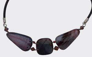 Mooie zwarte steen met grijs/bruine lijnen. Aan de voorkant zit de snaar erbovenop. Aan de achterkant zit een rond gat waardoorheen je de snaar kunt zien. Daar zie je ook de bruine lijnen die in de steen zitten beter. Erg mooie vorm die al in de steen zat toen ik eraan begon.