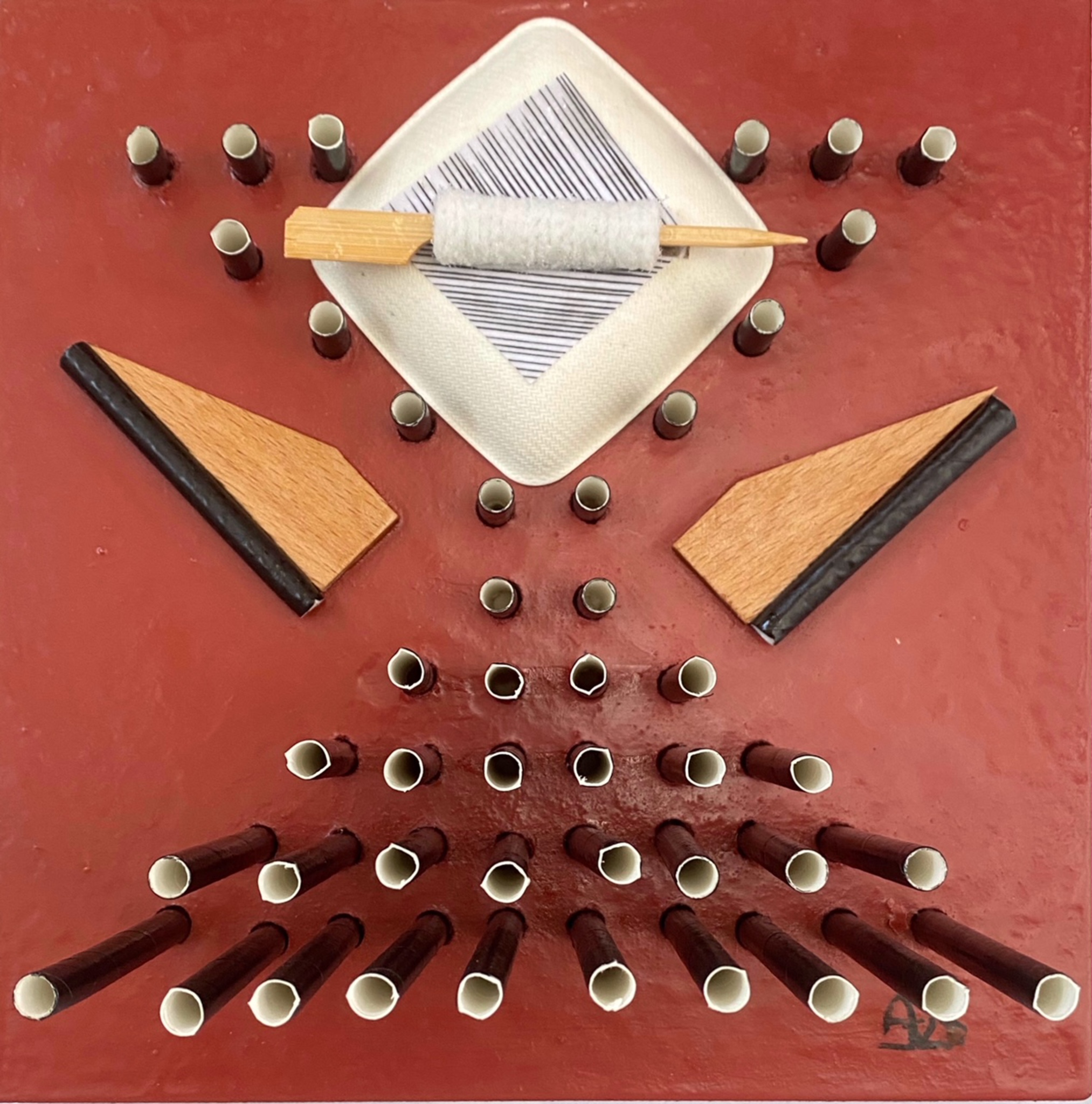 Compositie van verschillende materialen aangebracht op MDF boven op het glas van de lijst met passepartout bevestigd. Afmeting geheel: 25,5cm x 25,5cm. Beschikbaar
