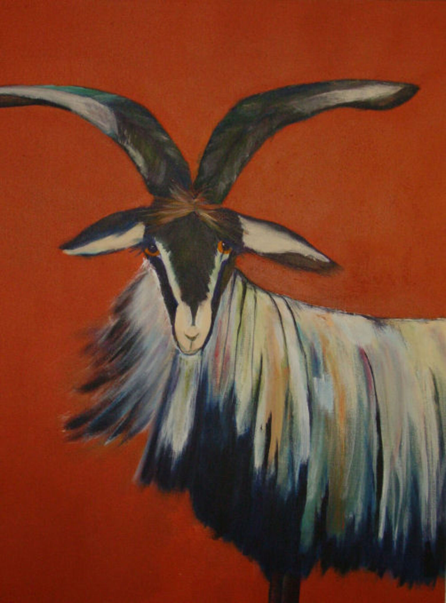 Een vriendelijke, kleurrijke geit kijkt je aan.