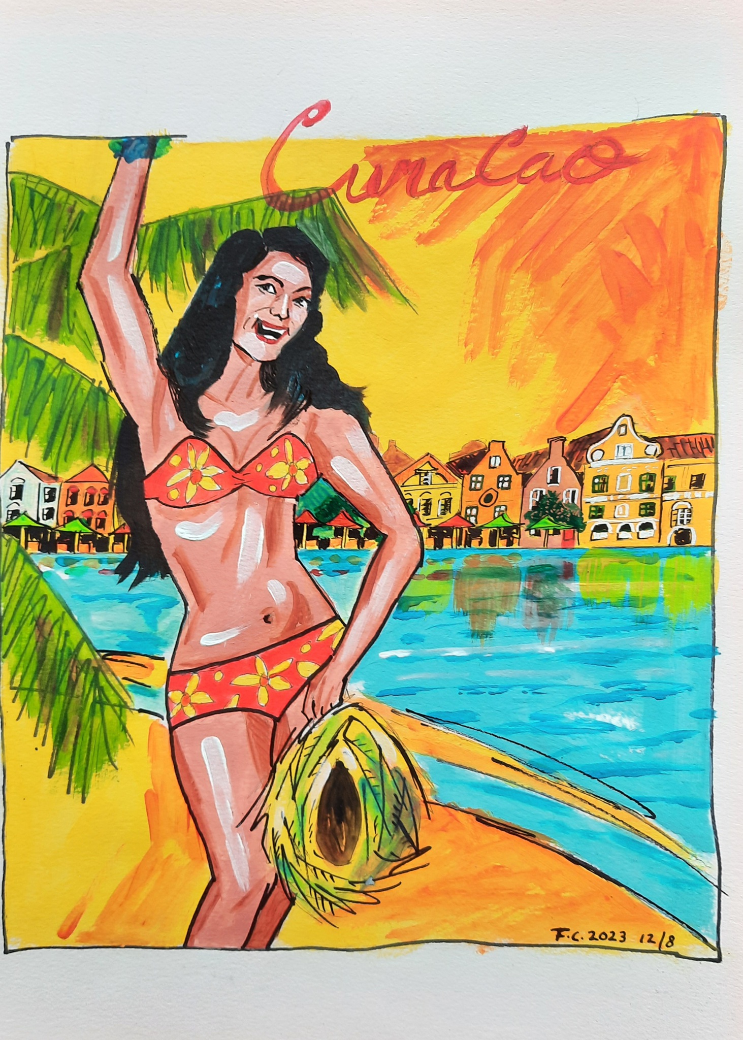 Zee Strand Vrouw Vakantie Bikini Curacao Popart