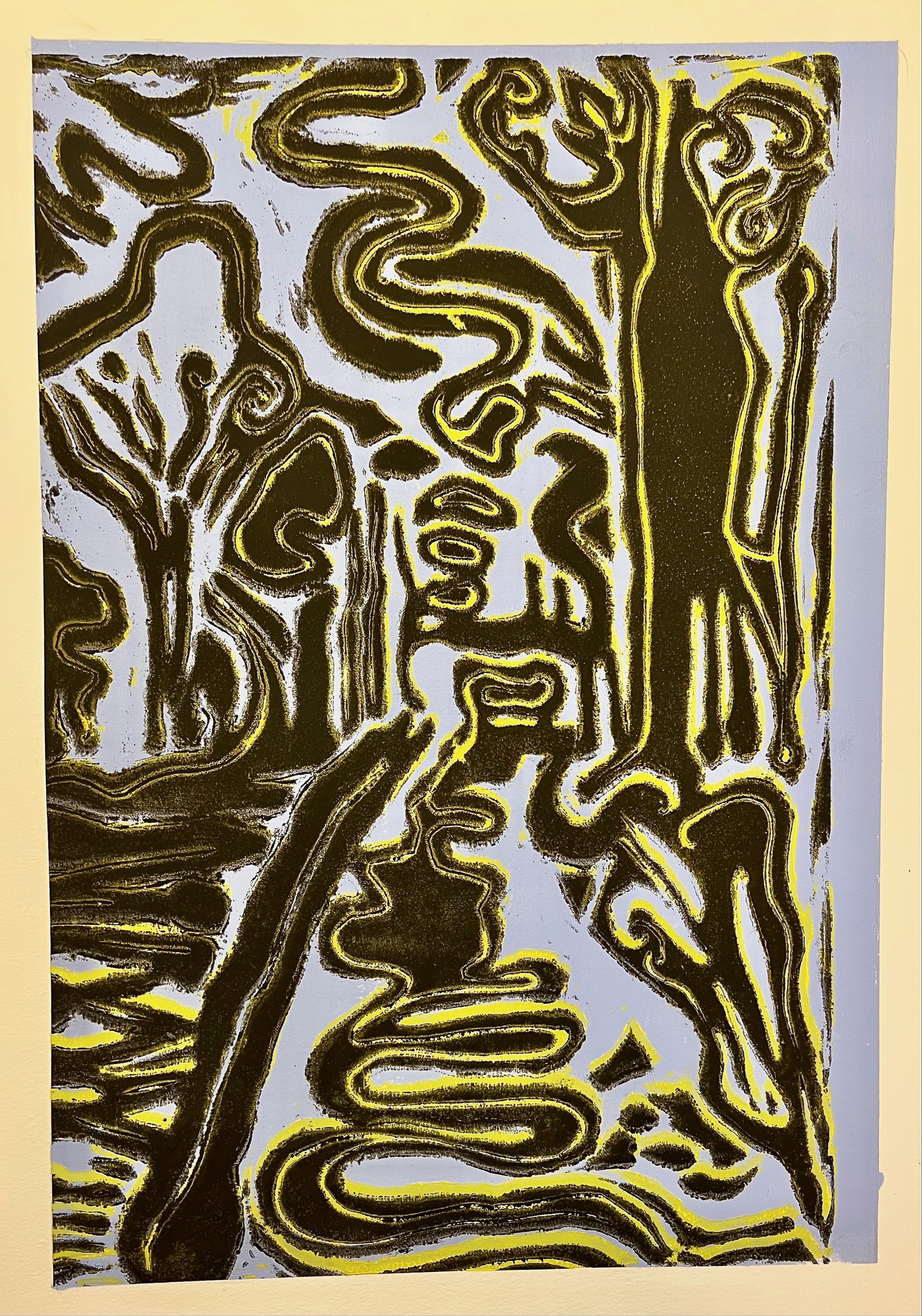 Geinspireerd op een wandeling door de "Schoorlse duinen". Deze linoleum druk heb ik gemaakt in verschillende kleur combinaties. Deze is in de combinatie Blauw/geel/zwart