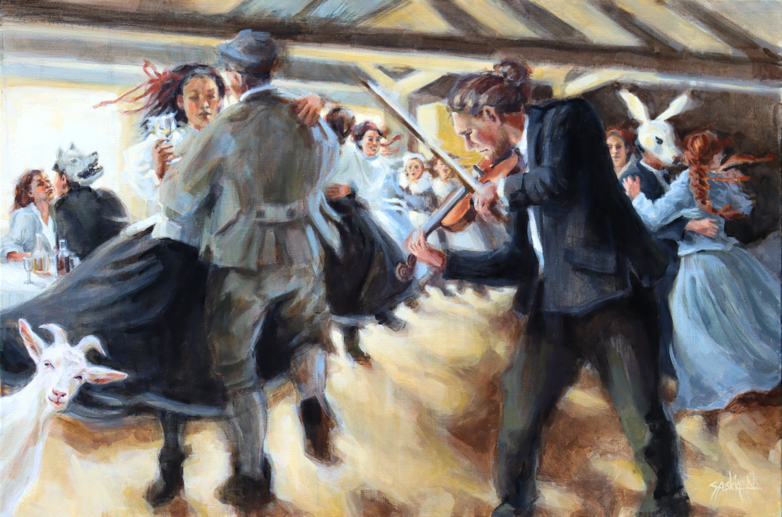 Impressie van een schuurfeest in Drenthe rond 1840, naar aanleiding van het boek 'de 3 Podagristen'.