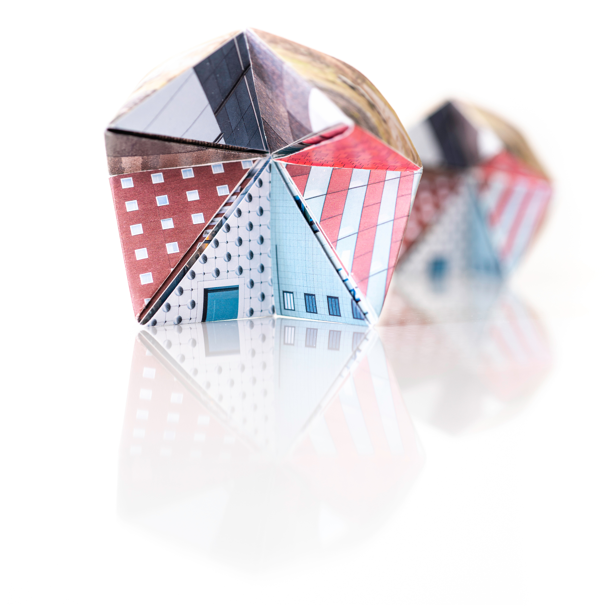 Foto van een compositie van twee 'Stadhuisorakels'. Deze Stadhuisorakels zijn gemaakt van eigen foto's die geprint zijn op vouwpapier en vervolgens gevouwen tot 'happertje'.