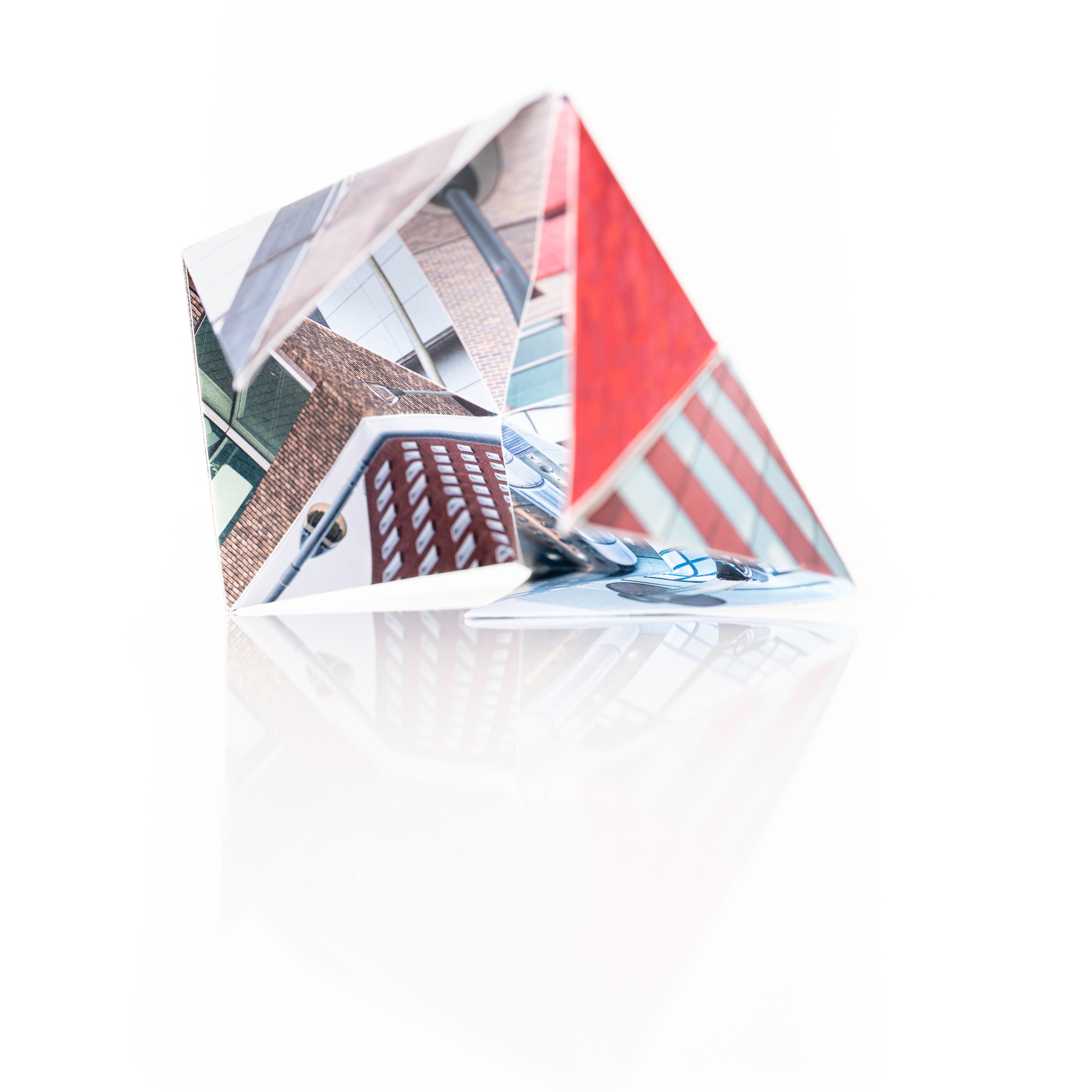 Foto van een compositie van een 'Stadhuisorakel'. Het Stadhuisorakel is gemaakt van eigen foto's die geprint zijn op vouwpapier en vervolgens gevouwen tot 'happertje'.