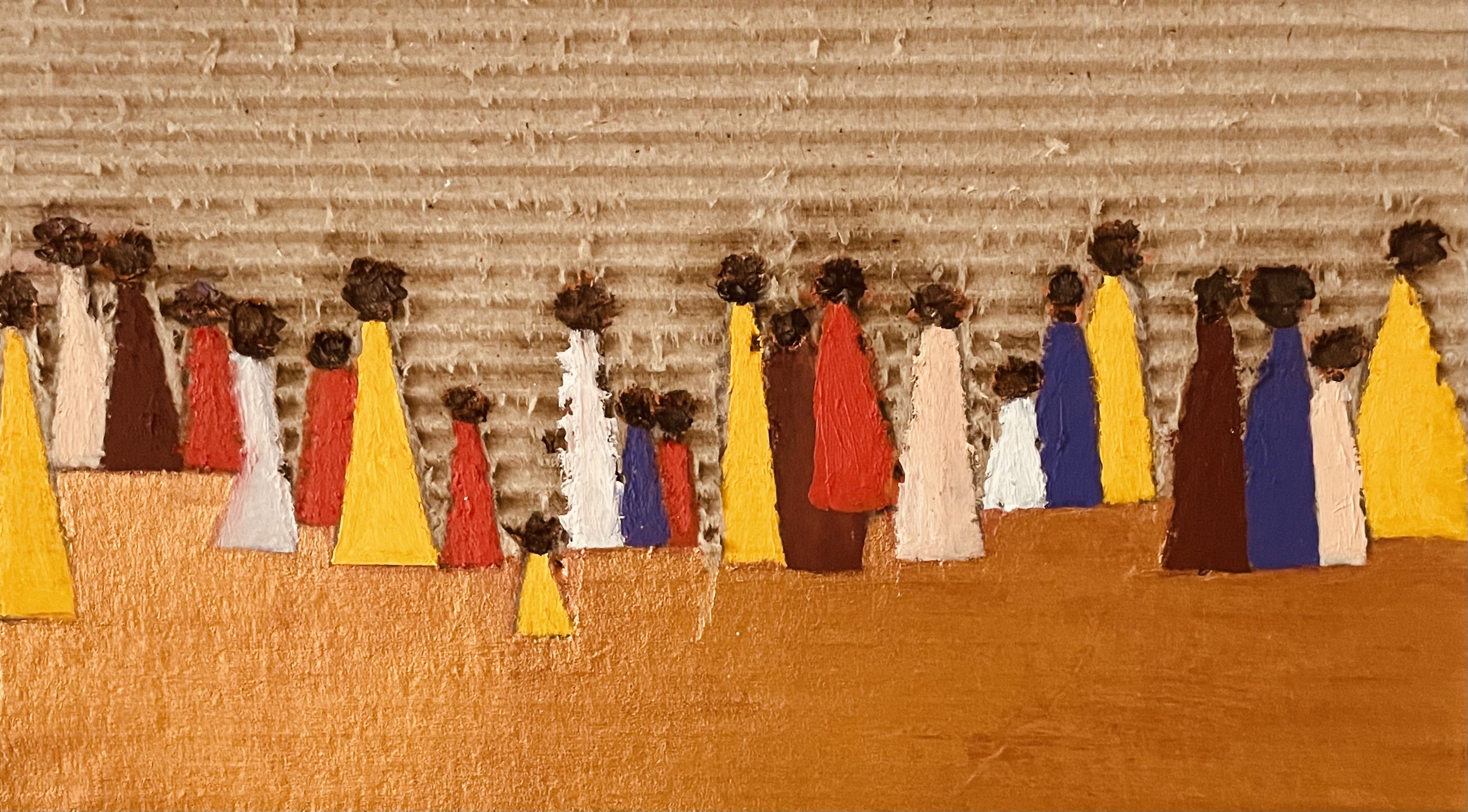 Een geïnspireerd door de vluchtelingen problematiek, groep van niet bestaande personen. Geschilderd op stuk 'gespeten' karton.