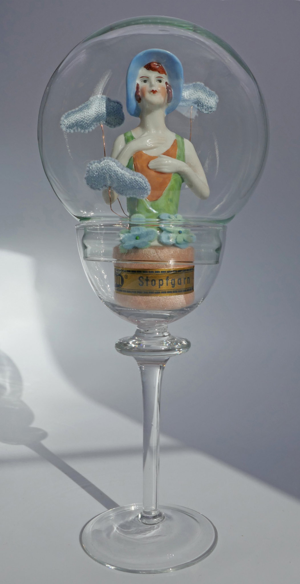 wol vilt, glas, antiek keramiek poppenhoofdje, glansgaren, stopgaren.