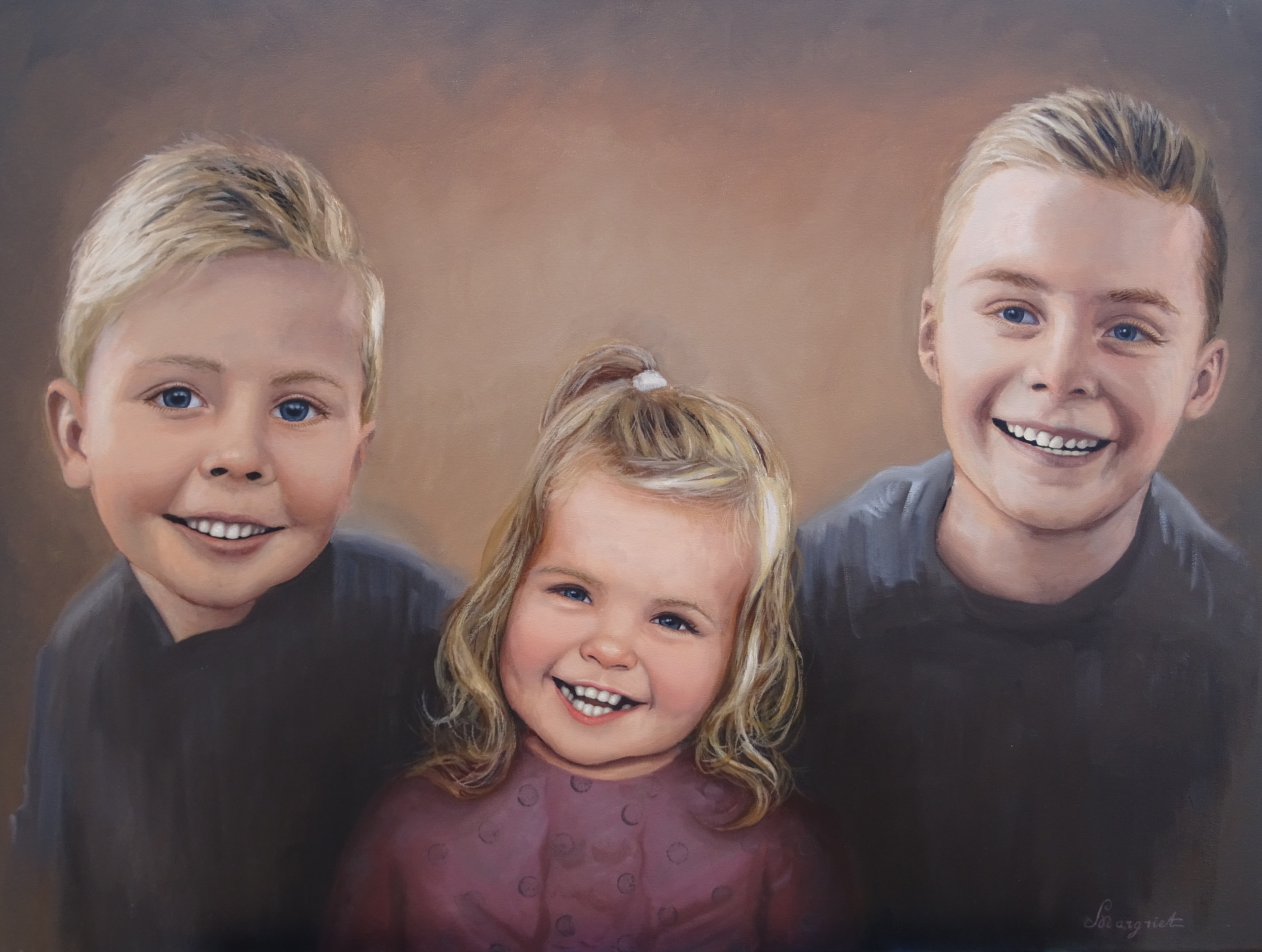 3 kinderen uit 1 gezin geschilderd naar 3 verschillende aangeleverde foto's op 1 doek.