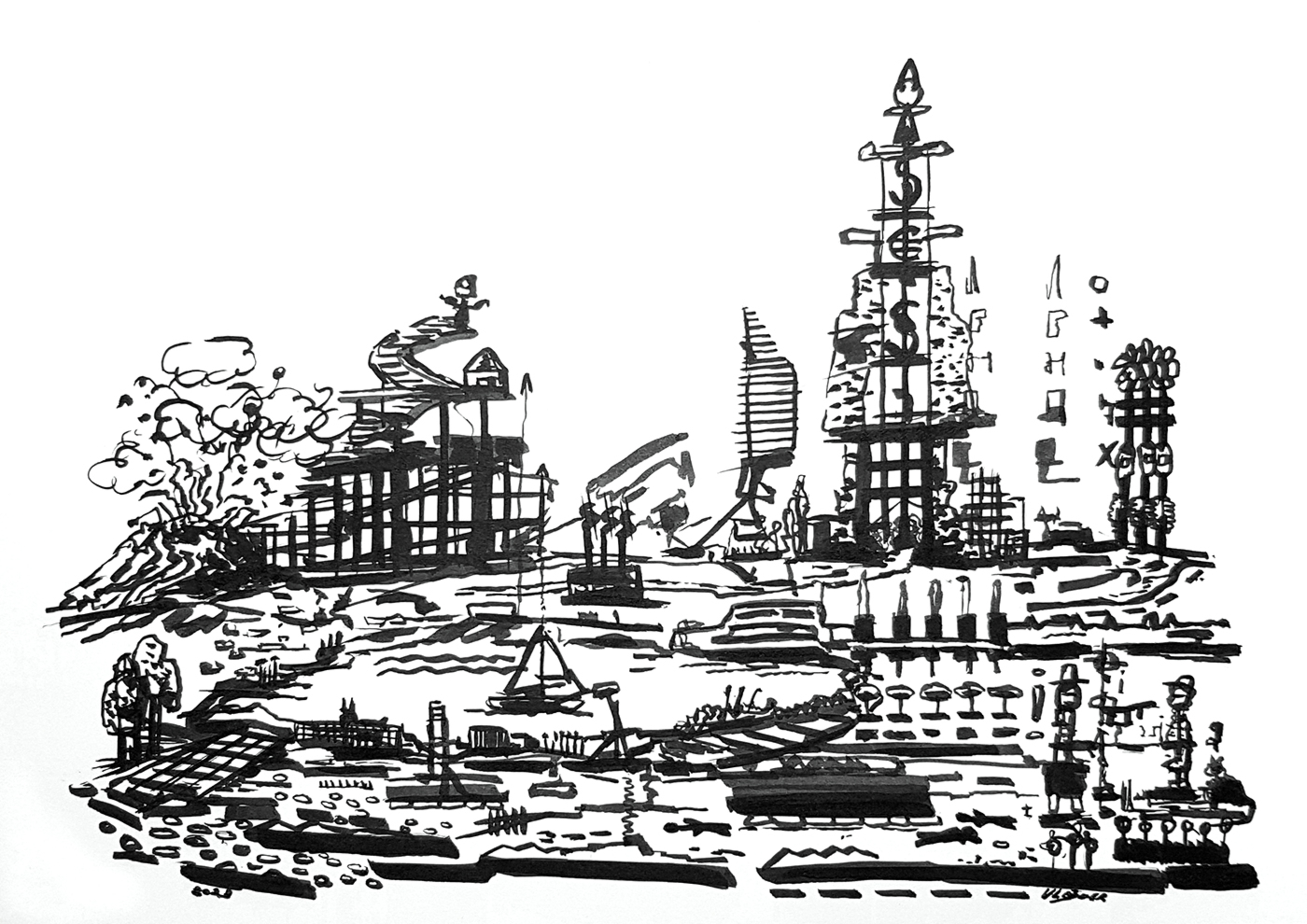 Wereld Oorlog Natuur Vervuiling Klimaatverandering Macht Geld Prestige Architectuur Finale Mens Vulkaan Inkt Oostindischeinkt Tekenen Tekenkunst Kunst Kunstenaar Zwartwit Politiek