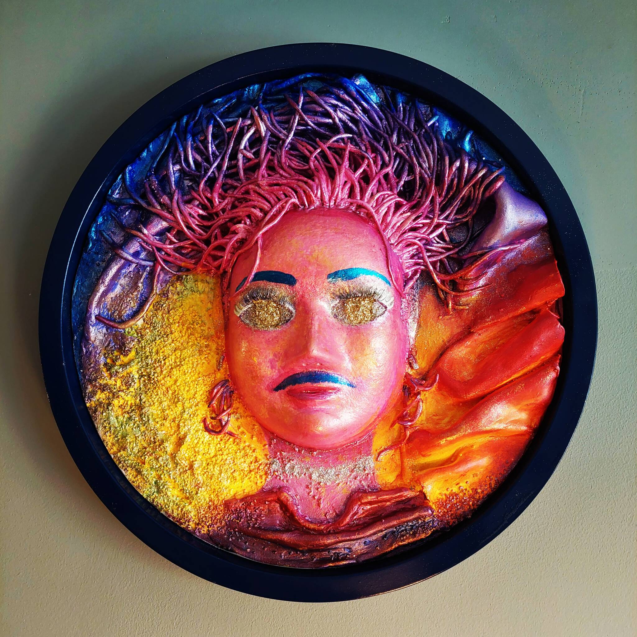 Acryl, zand, steentjes, klei, glitters op canvas. Een ode aan de lgtbq + gemeenschap. Dat je jezelf mag zijn, zonder je onveilig te voelen.