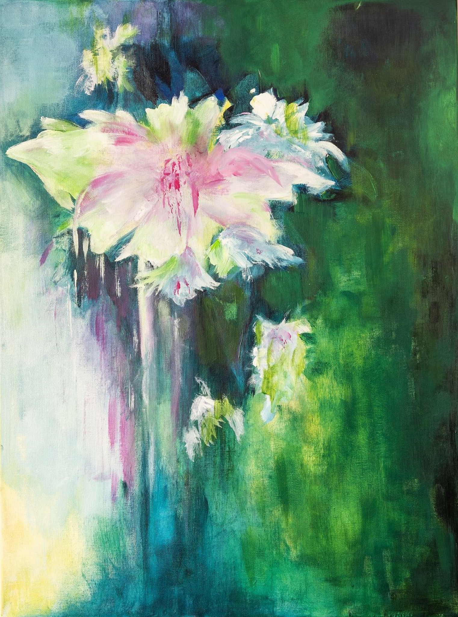 Witte bloem in het groen Vooral het contrast van de witte bloem in het groen is bepalend. De achtergrond heeft veel kleuren door het groen heen. Gemaakt in acryl verf en vooral met spons doorheen gemengd Afmeting is 60 breed en 80 hoog.