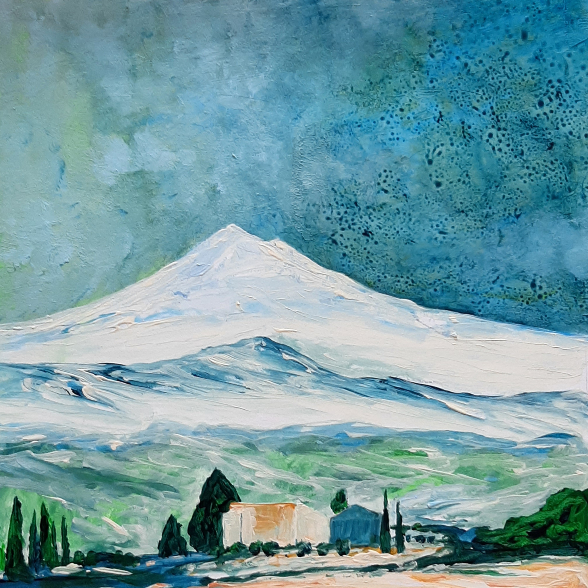Opnieuw schilderde ik de Mont Ventoux (1909 meter hoog). Maar nu op papier De machtige berg in het zuiden van Frankrijk, de renners in Tour de France vrezen deze gigant. Verschillende keren was ik er boven op. De berg intrigeert me. Tijdens vakanties keken we er vaak letterlijk tegenop. Ik las er boeken over. Zag de film Ventoux, naar het boek van Bert Wagendorp. Na een aantal schilderijen op doek is deze op stevig schilderpapier gemaakt. De vermelde prijs is exclusief passe-partout en/of lijst