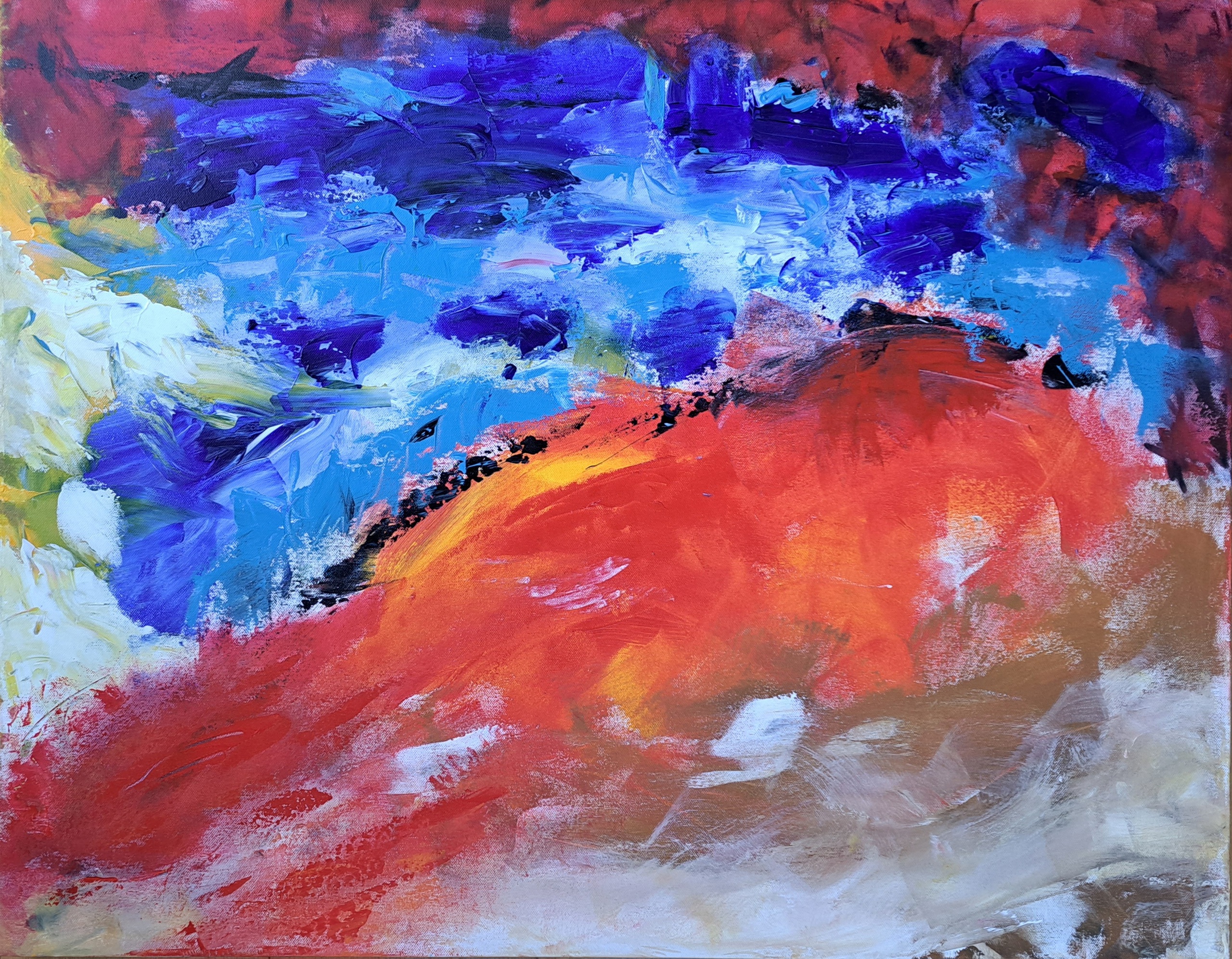 Dit kleurrijke werk toont twee werelden: een bruisende, levendige bovenlaag en een kalme, aardse onderstroom. Een schilderij dat uitnodigt om stil te staan bij contrast én verbinding.