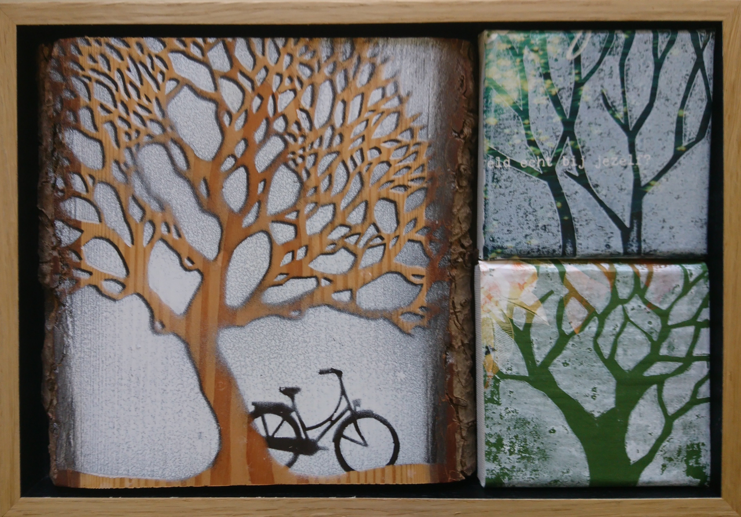 Compositie van 3 werkjes in een baklijst. Een gespoten boom op hout en twee kartondrukken op papier.