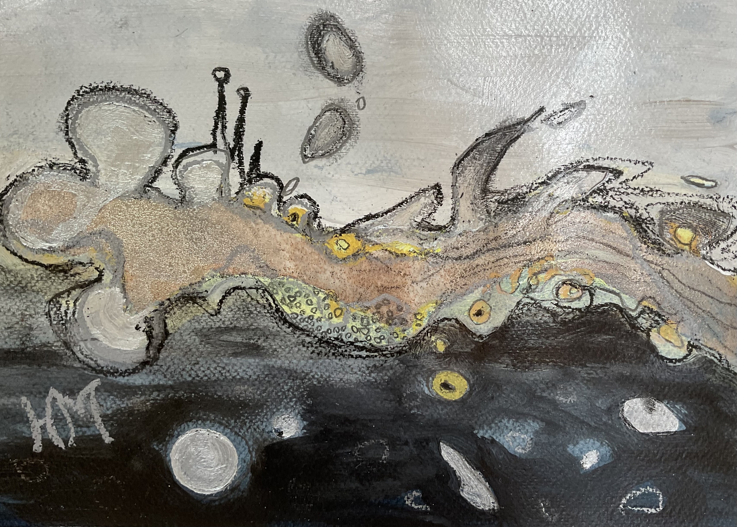 Acrylverf, zand, oliepastel en potlood op 300 g/m2 aquarelpapier.