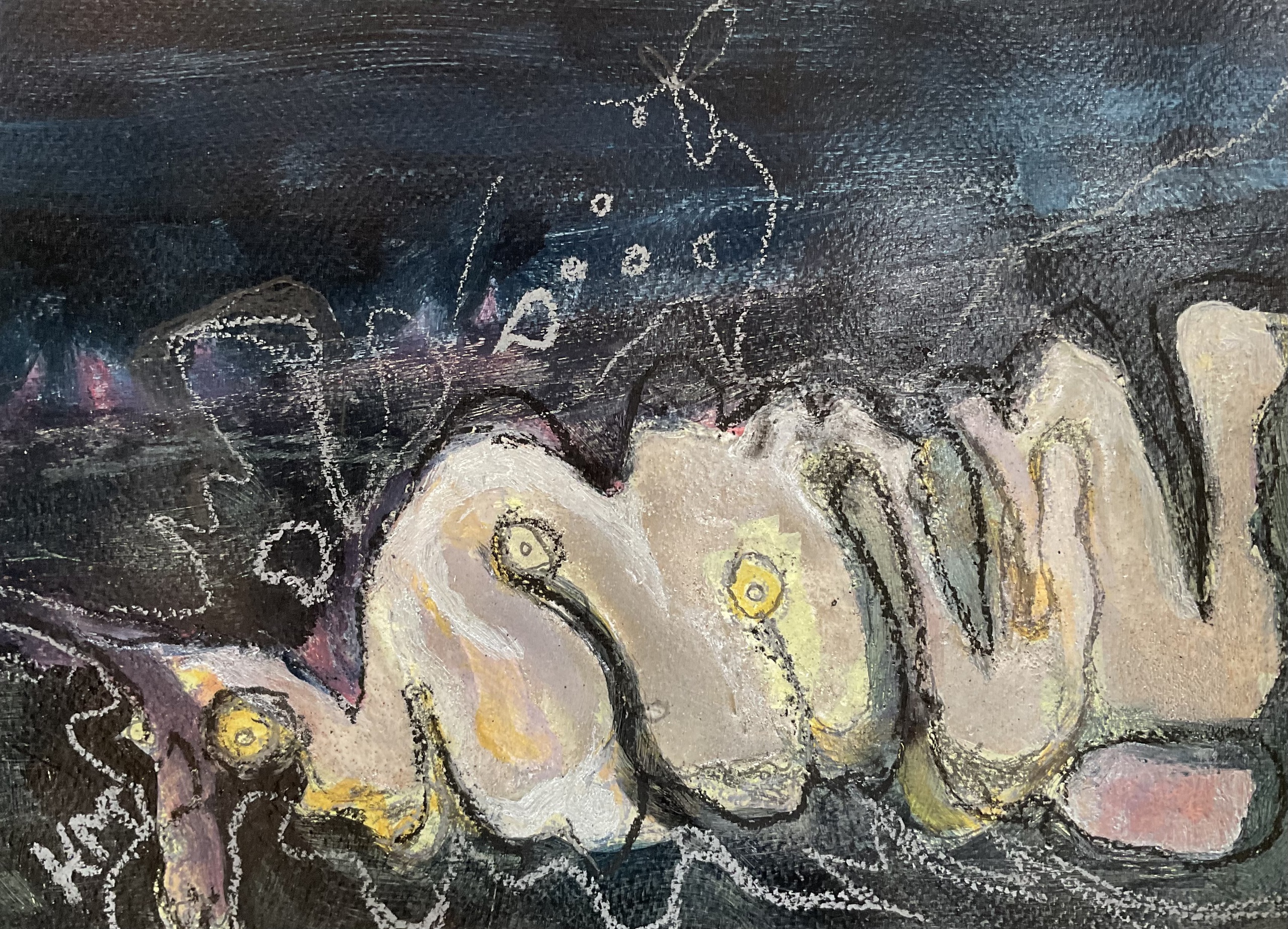 Acrylverf, zand, oliepastel en potlood op 300 g/m2 aquarelpapier.
