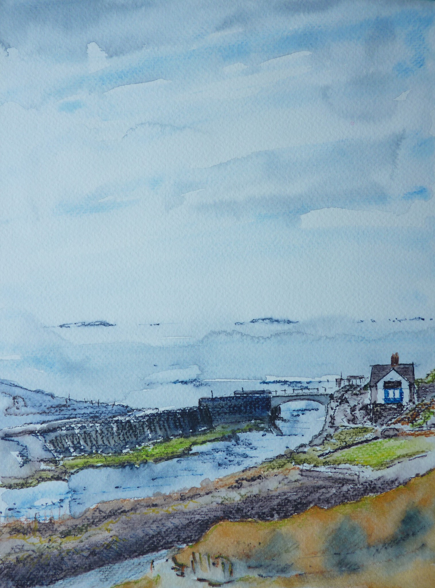 Zicht naar de brug naast Tan-y-blch en de zee bij Aberystwyth. Gemaakt met Inktense potloden en aquarel.