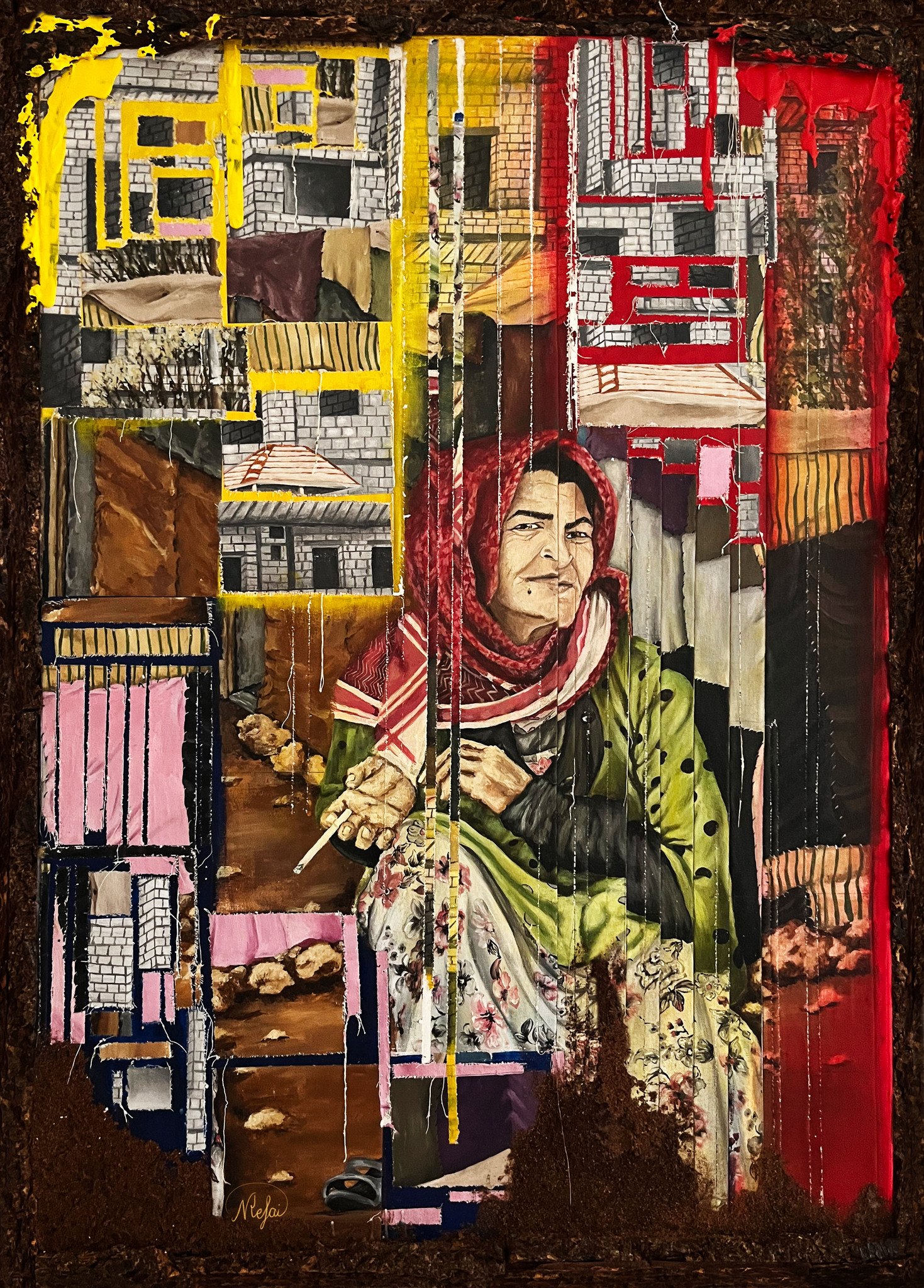 Ouderen soms terughoudend zijn om hun huis te verlaten en vaak de laatsten zijn die voor gevaar vluchten. In kampen kunnen ze sociaal geïsoleerd raken en fysiek gescheiden raken van hun families, wat hun kwetsbaarheid vergroot. Ouderen kunnen effectief bijdragen aan hun families en gemeenschappen, zelfs als ze ontheemd zijn. Technieken en materialen: Het frame van het schilderij is een representatie van de bescherming die grootouders hun kinderen bieden door middel van zorg en advies, net zoals de boom zijn essentie beschermt, en hiermee wil ik het belang benadrukken van de rol van grootouders in de levenscyclus van kinderen en kleinkinderen.
