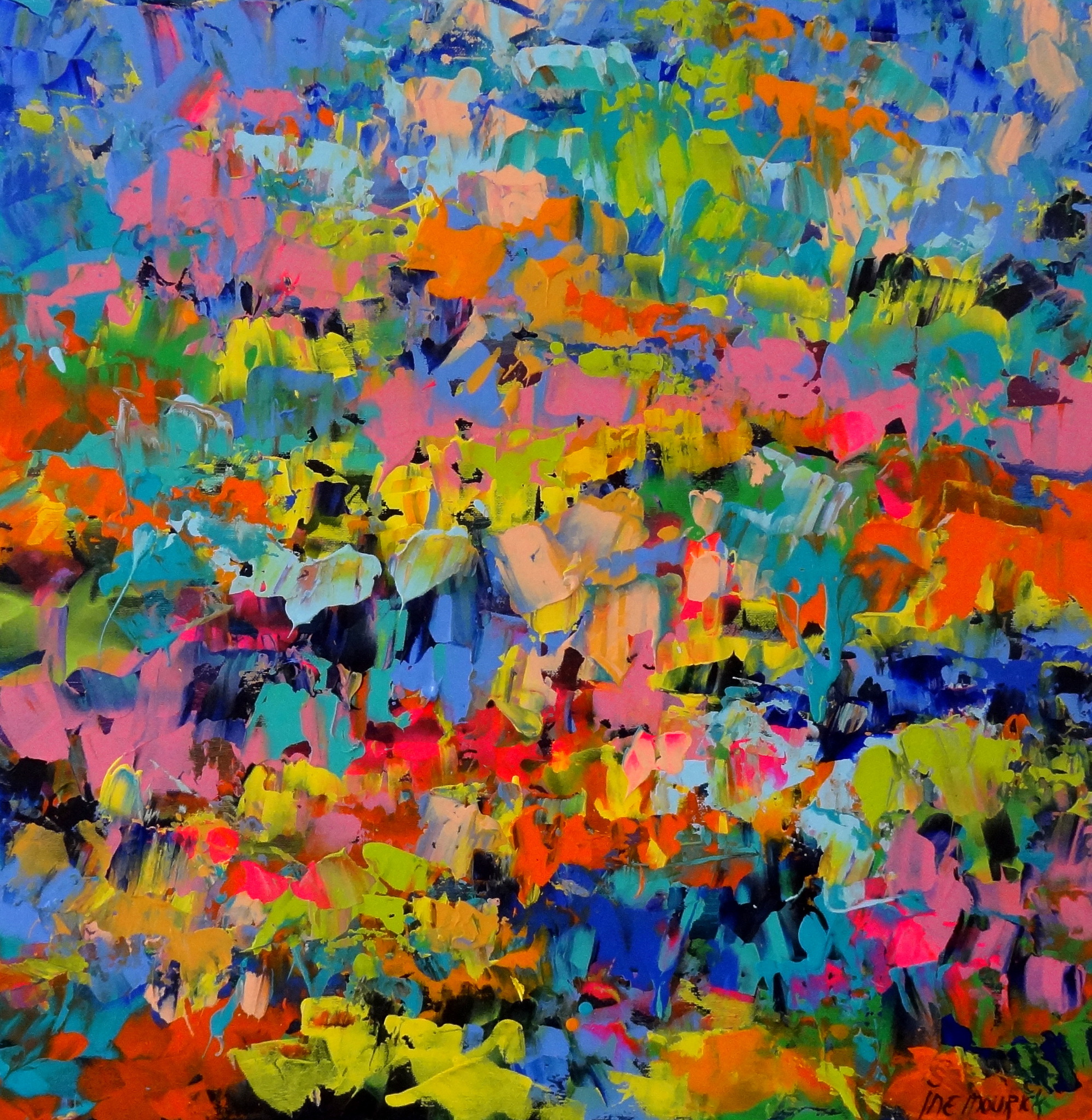 Expressief bijna abstract kleurrijk zomers schilderij. Mijn inspiratie: de bloemen en planten in de tropen met hun vrolijke, bijzondere kleuren en het verlangen in de winter, naar een vakantie in een warm exotisch land. De zijkanten van het canvas zijn meegeschilderd. Het schilderij is afgewerkt met een satijn vernis. Ingelijst in een houten baklijst in de kleuren zwart en zilver.