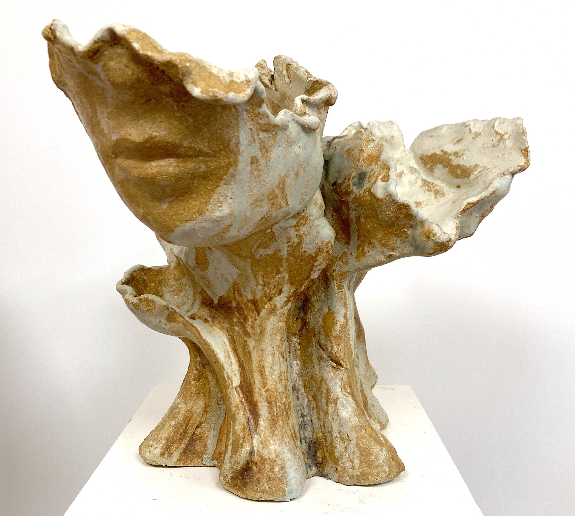 Beeld van klei, abstract. Natuur. Boomachtig vorm met onderdelen van gezichten. Het beeld is hooggestookt , d.w.z. het beeld kan buiten en binnen staan. Kleuren donkergeel, groen, beige, wit. Materiaal: Klei, glazuren, oxydes. Tegen meerprijs kan het beeld op een (bijv stenen) sokkel gemonteerd worden.