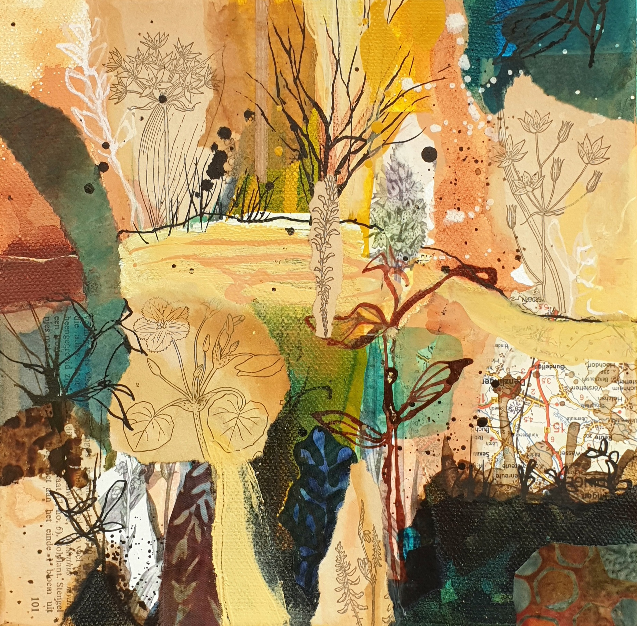 Acrylinkt, acrylverf en collage op doek, afgewerkt met epoxyhars