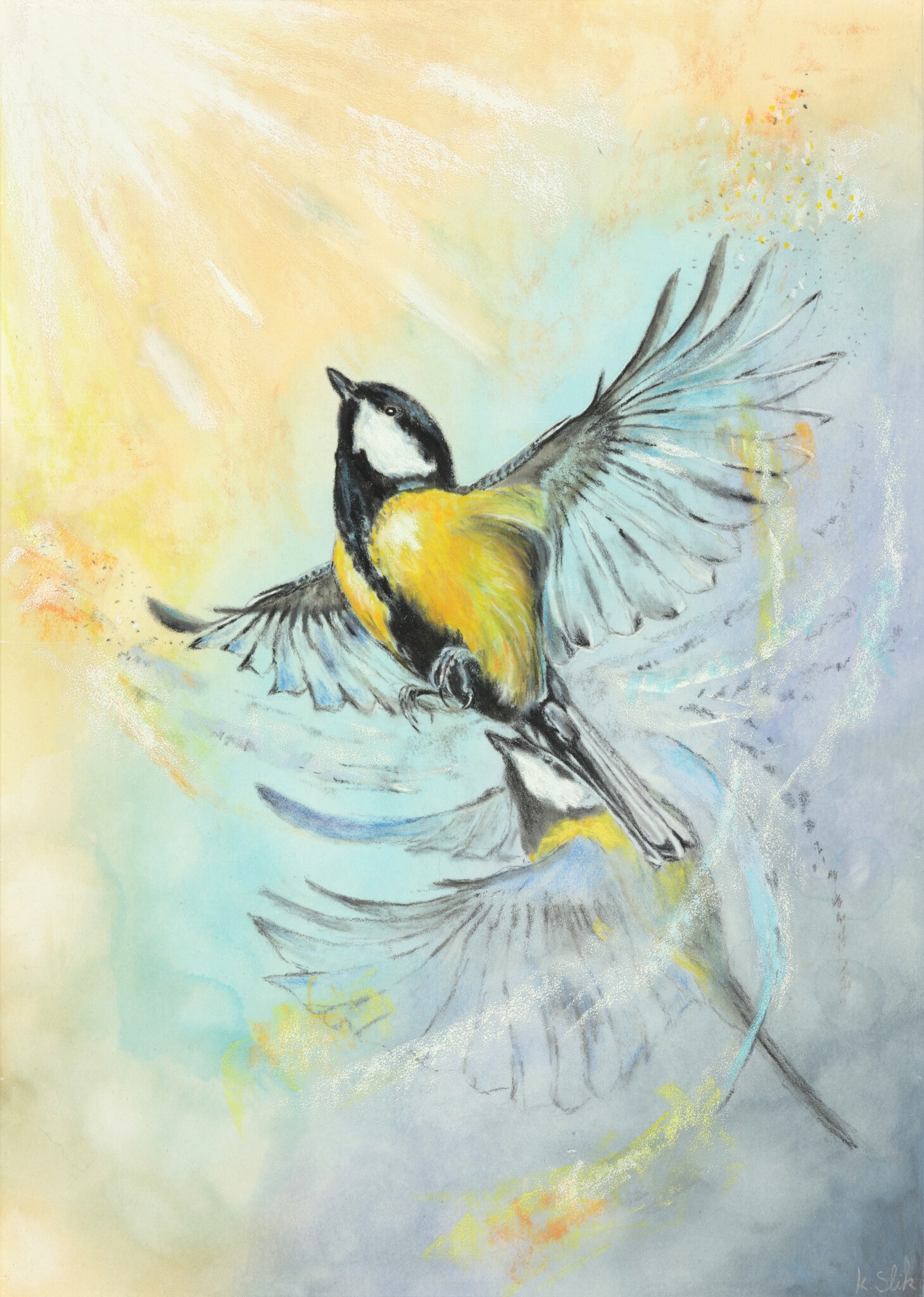 Prachtige hoge kwaliteit gicléeprint op A3 formaat papier. Wordt geleverd met een gesigneerd certificaat van echtheid. Gelimiteerde oplage! DIt is de tweede mixed media die ik heb gemaakt omdat het mij beviel om aquarel als ondergrond te nemen en daar pastel overheen te doen. Het pastel pakt niet makkelijk op deze ondergrond, maar het lukt wel. Het is een bijzondere combinatie, dat een uniek effect geeft aan het werk. De vogel is een koolmeesje dat opvliegt naar het zonlicht. Beweging in een werk fascineert mij zeer. Al tekenend kreeg ik een gevoel van hoop, van lichtheid, van optimisme, van vrolijkheid, van voorspoed, van vrijheid. De vogel richt zich op het licht, het vliegt weg uit de schaduw, de zon tegemoet. De weidse lucht in, vrij om te gaan waar het maar wil gaan. Koolmeesjes zie ik veel in onze tuin. Als ik ze zie dan geven ze me het gevoel van levenslust en luchtigheid. En herinneren ze mij eraan om niet te zwaar te tillen aan het leven en je gedachten lichter te maken. Het origineel is ook te koop.
