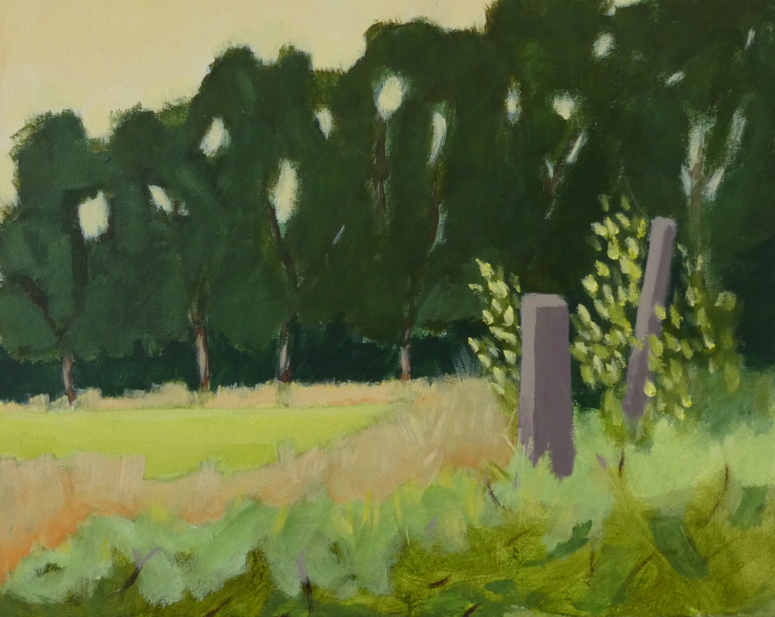 Op de hoek van het land staat een markeringspaal. Ik zat hier een middag in augustus, met zicht op de wide en het bos erachter. Het was heerlijk weer, met wat wind, de zon en de vogels. Dit schilderij is en plein air gemaakt in acryl op canvas.