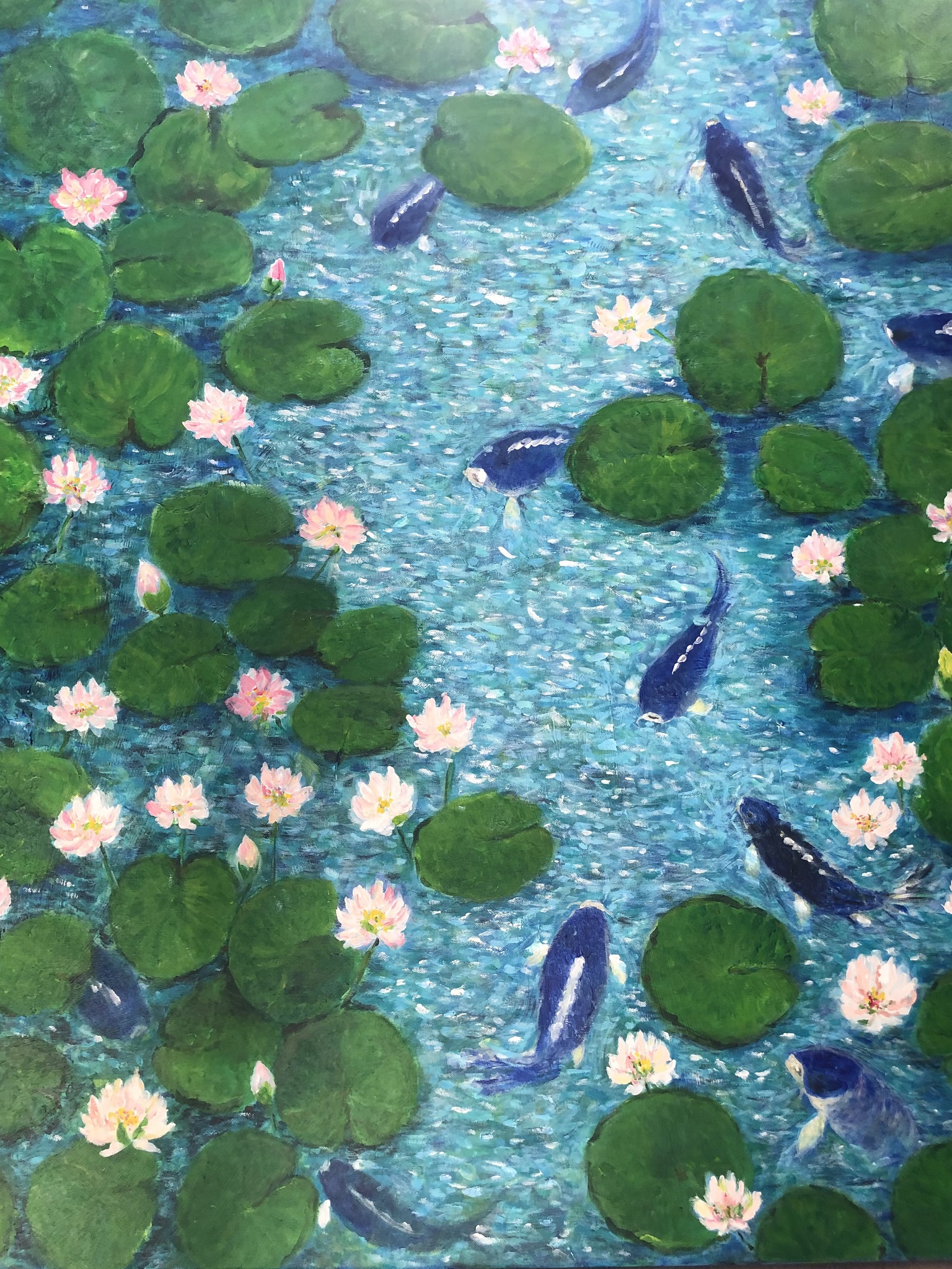 Vogelperspectief van vijver met karpers en waterlelies