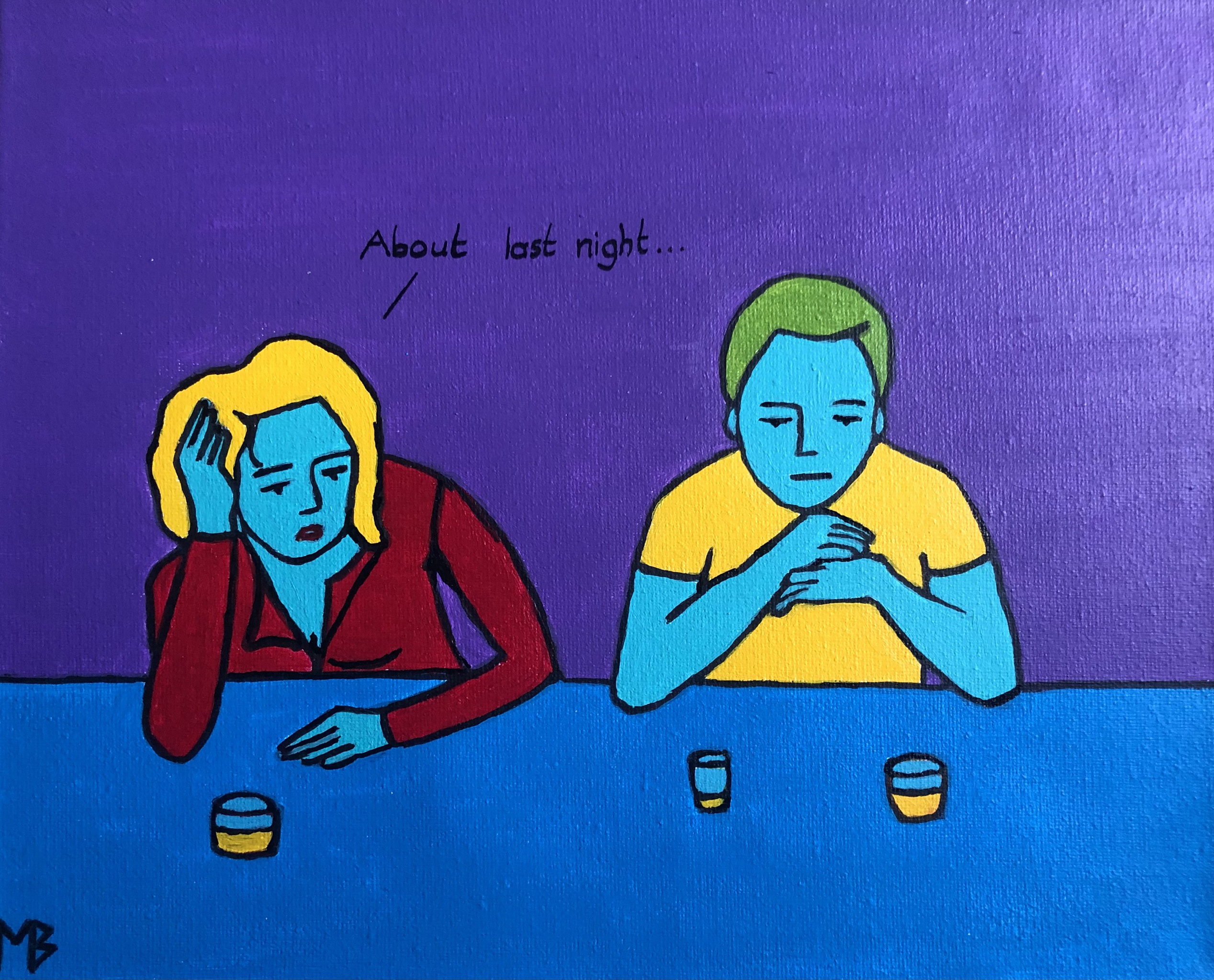 Twee mensen aan de bar, met blijkbaar een ongemakkelijk gesprek in het verschiet. De kleuren van het schilderij vormen een contrast met de situatie.