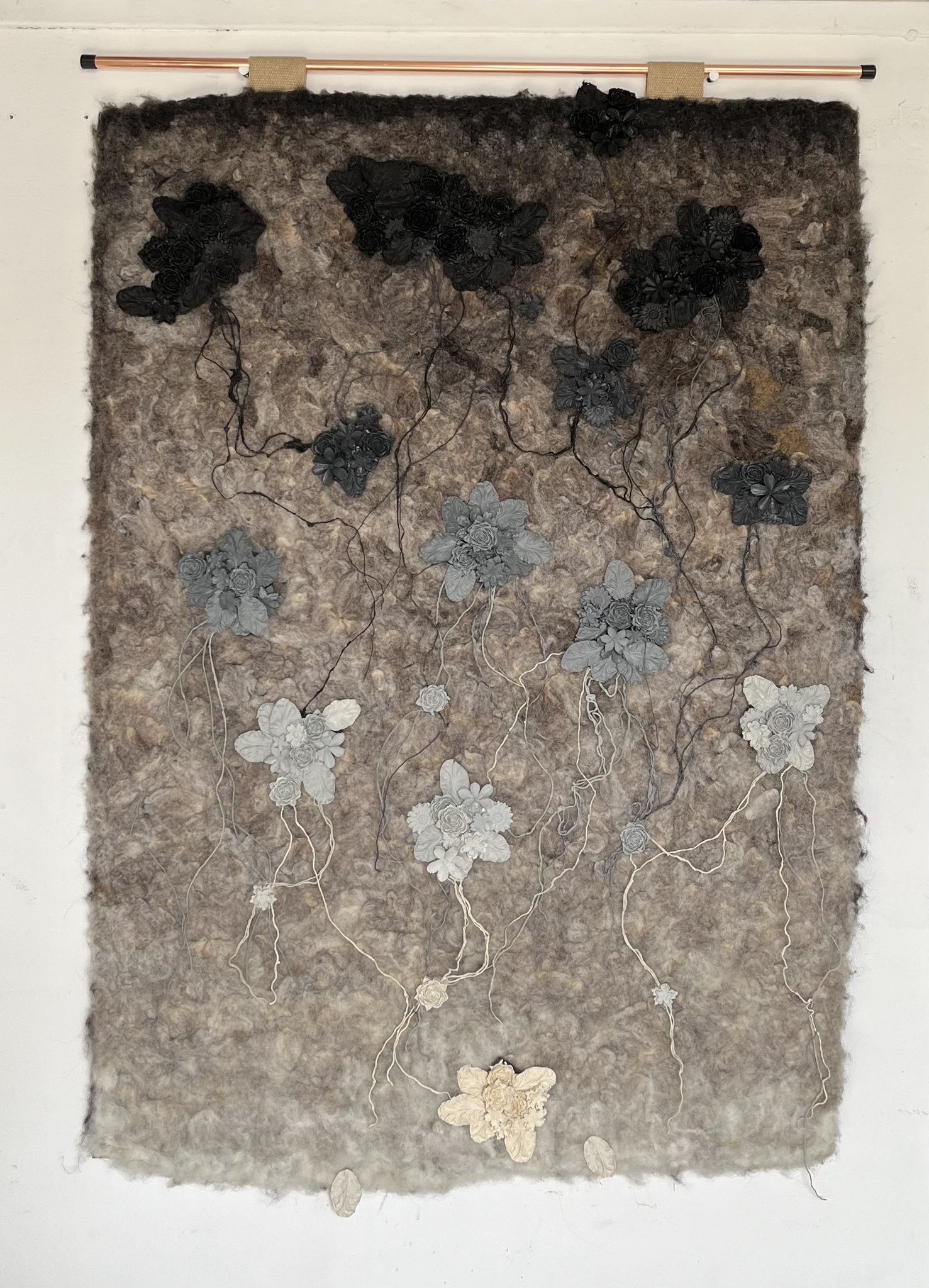 Viltwerk 7 (2023) Wol en latex Bloemvormen met draden op vilt. Groei, verval, organische verbinding.