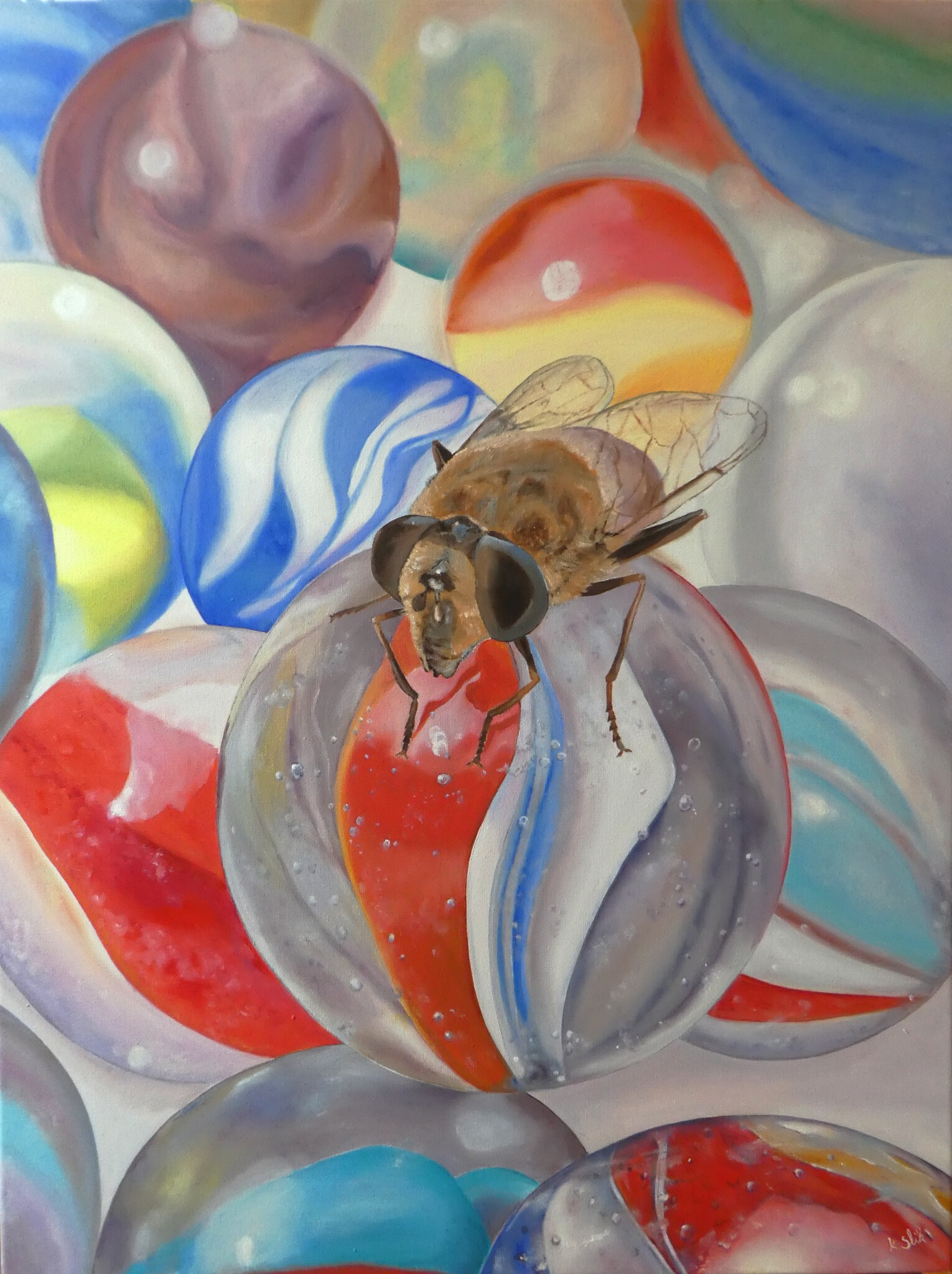 Dit olieverf schilderij heb ik gemaakt aan de hand van een foto die ik maakte van enkele knikkers die ik buiten had uitgestald. Een vlieg die wel wat weg had van een bij vond het wel een leuk plekje. Of is het toch een bepaalde bijensoort? Er zijn namelijk veel verschillende soorten, dat is verbazingwekkend in het insectenrijk.