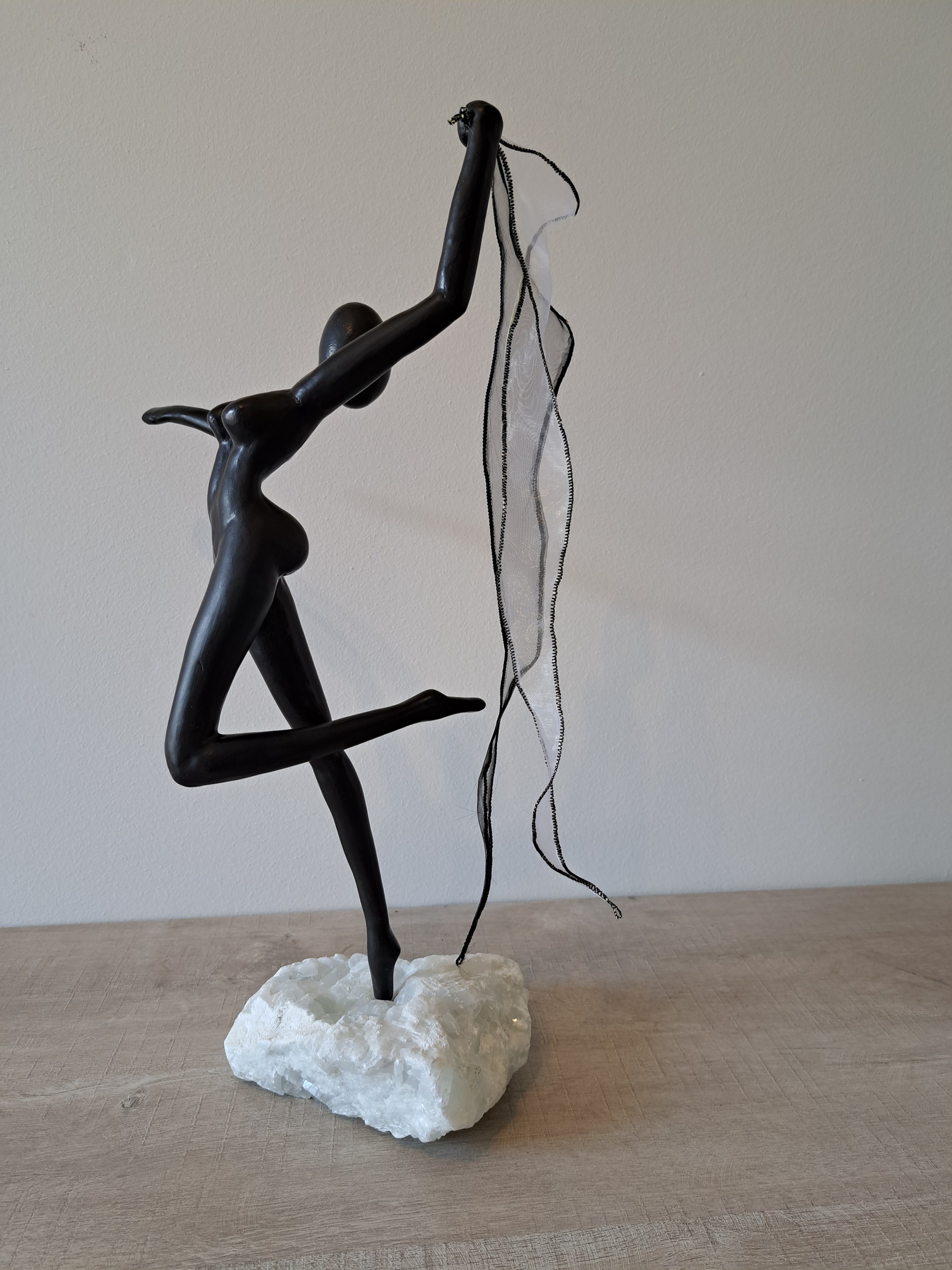 het dansende figuur wordt iedere keer in een andere houding gemaakt, op een andere steen en met andere linten die bij de kleur van de steen passen.