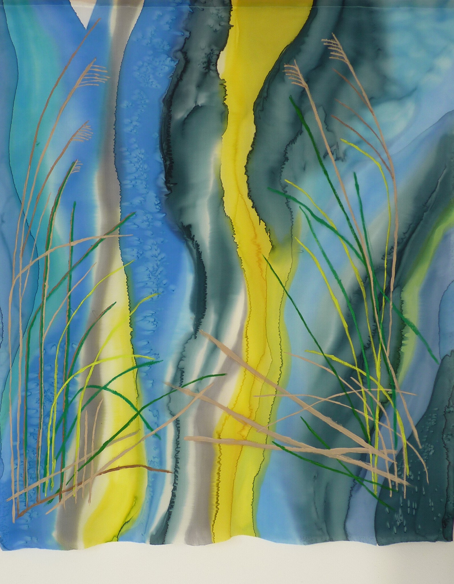 Het werk is geschilderd met zijdeverf op crèpe-de-chine. Het is een loshangend doek.