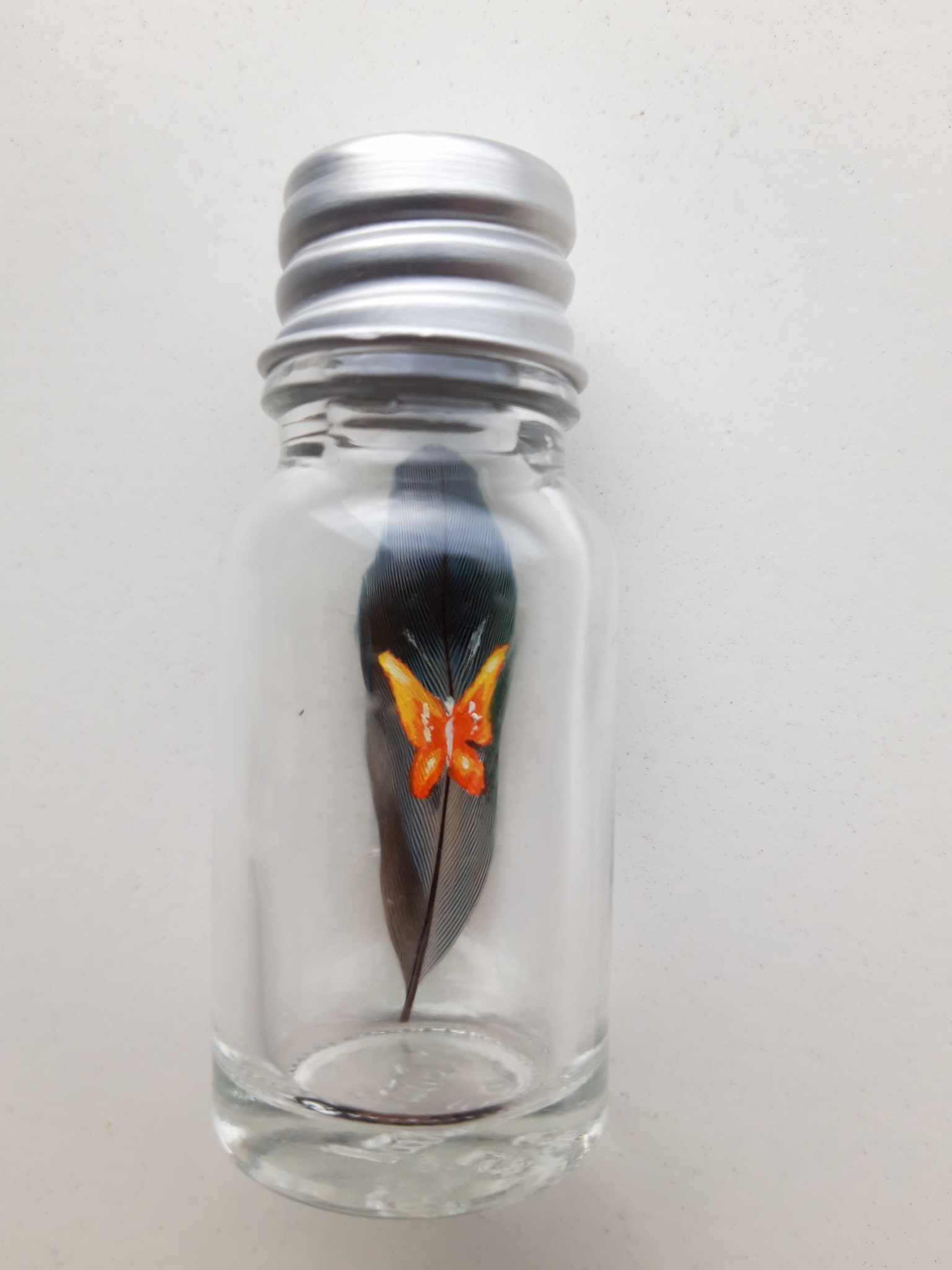 Collectie "Message in a bottle" Ieder flesje heeft een beschilderd mini veer met een afbeelding die een positieve boodschap brengt. -Lieveheersbeestje = doorzettingsvermogen. -Klavertjevier = geluk. -Madeliefje = ultieme liefde. -Vlinder = Creativiteit en de eigenschap van "van iets negatiefs , iets positiefs maken". De kleur van de veren kan varieren. Afmeting van de glazenfles is c.a. 2cm diameter en 6cm hoog. Prijs €6 per stuk. Verzending van 1 flesje kost €5,25 als brievenbus pakket met track and trace binnen Nederland. Verzending van meerdere flesjes kost € 8,25 met track and trace binnen Nederland. *De veren kunnen anders eruitzien met betreft tot de kleuren en vormen. Iedere veer is uniek.