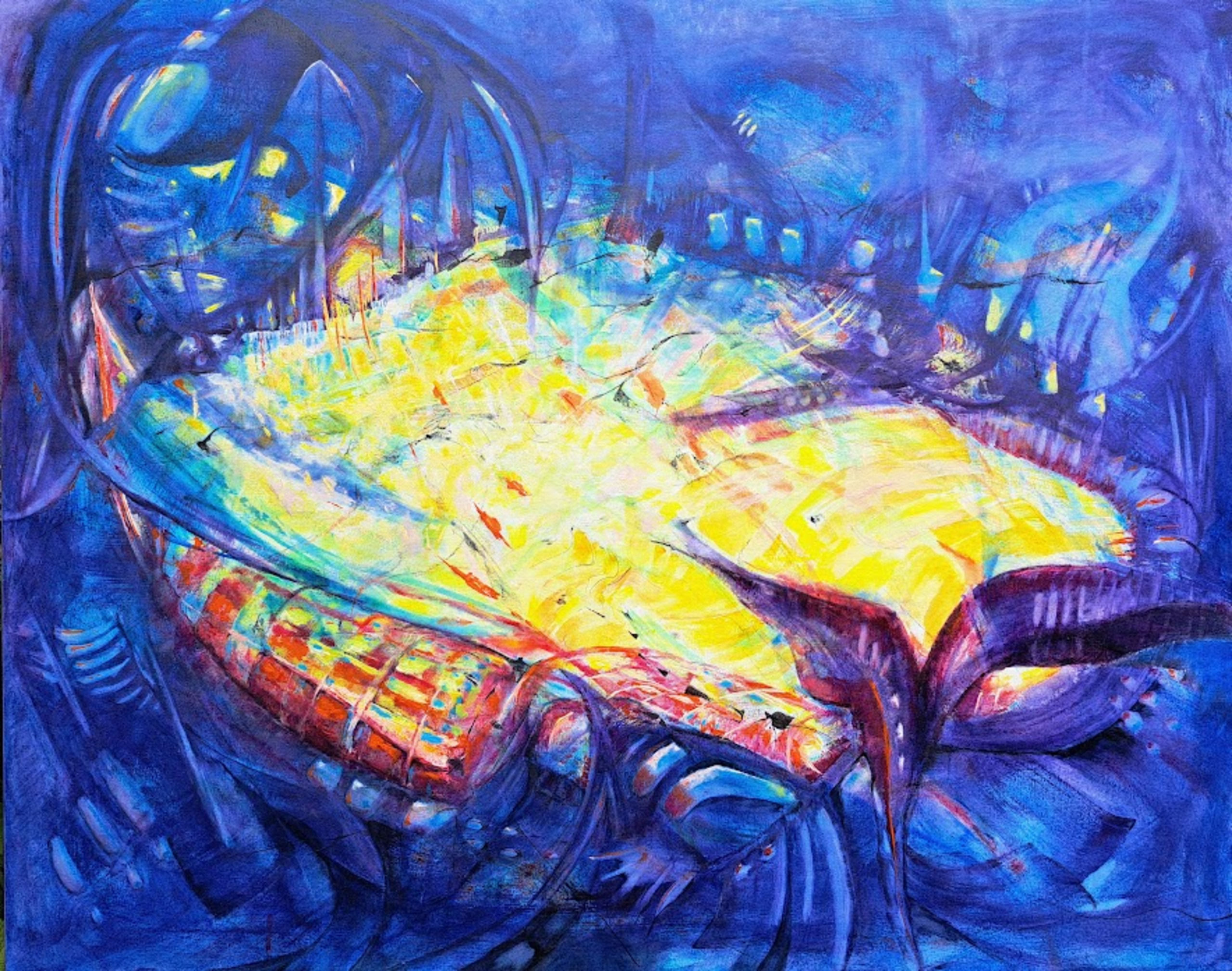 Dit tafereel komt tot stand, terwijl ik toeschouw. Mijn arm beweegt op het ritme van bewustzijn. Ik ben vrij. Olieverf op doek 80x100cm