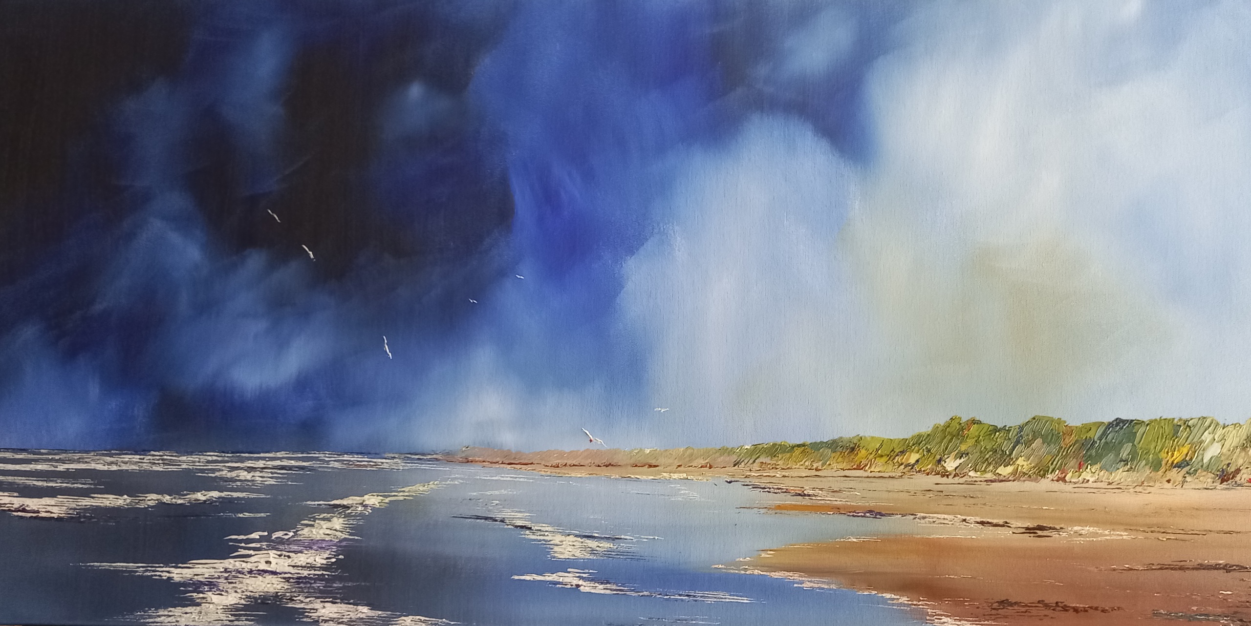 Dreigende luchten boven het strand, geen zwemmers of wandelaars. Met dit weer heb je het strand voor jezelf.