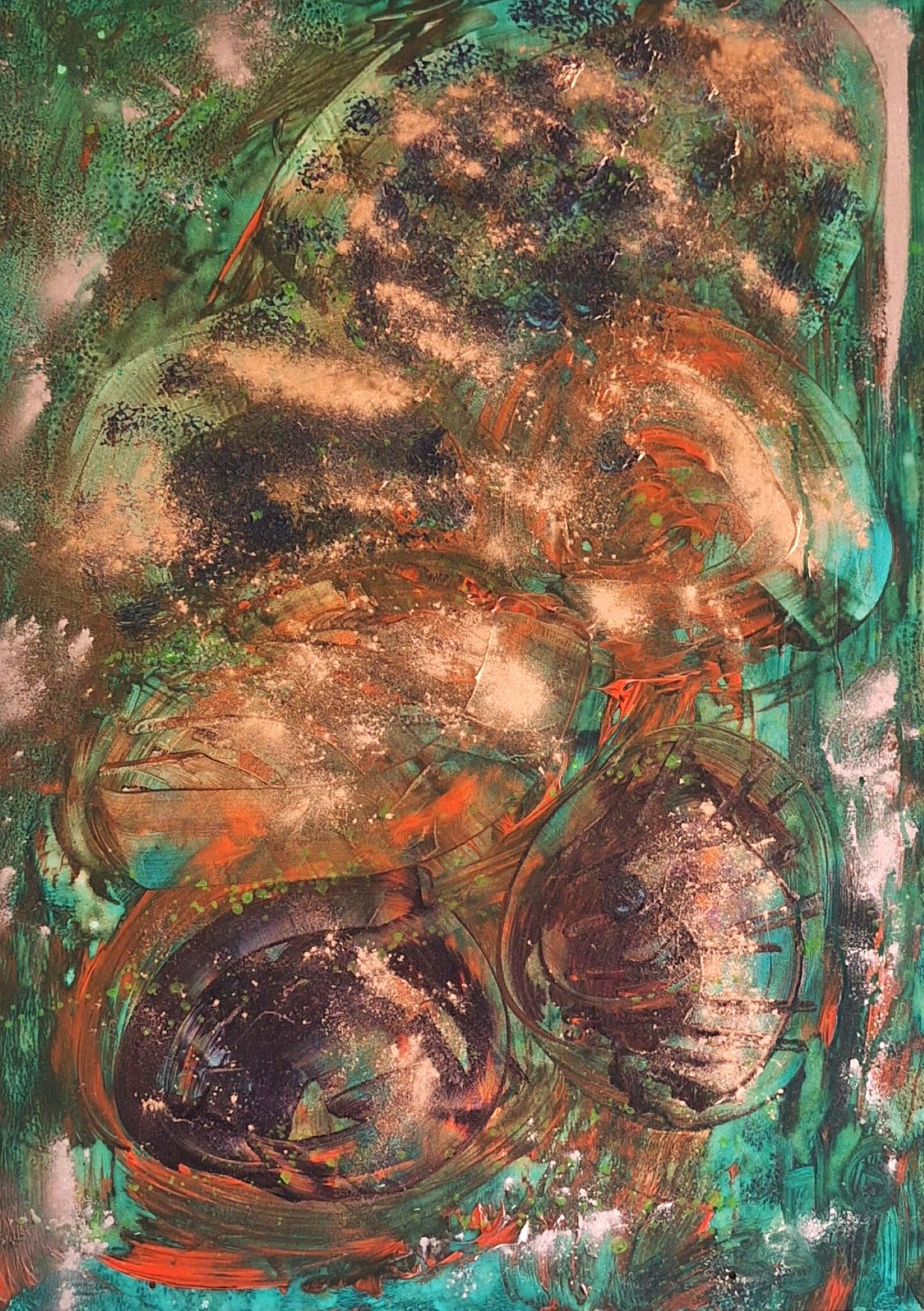 Een abstraherend schilderij geínspireerd op de oorsprong (embryo's). Het wordt ingelijst met passepartout geleverd.