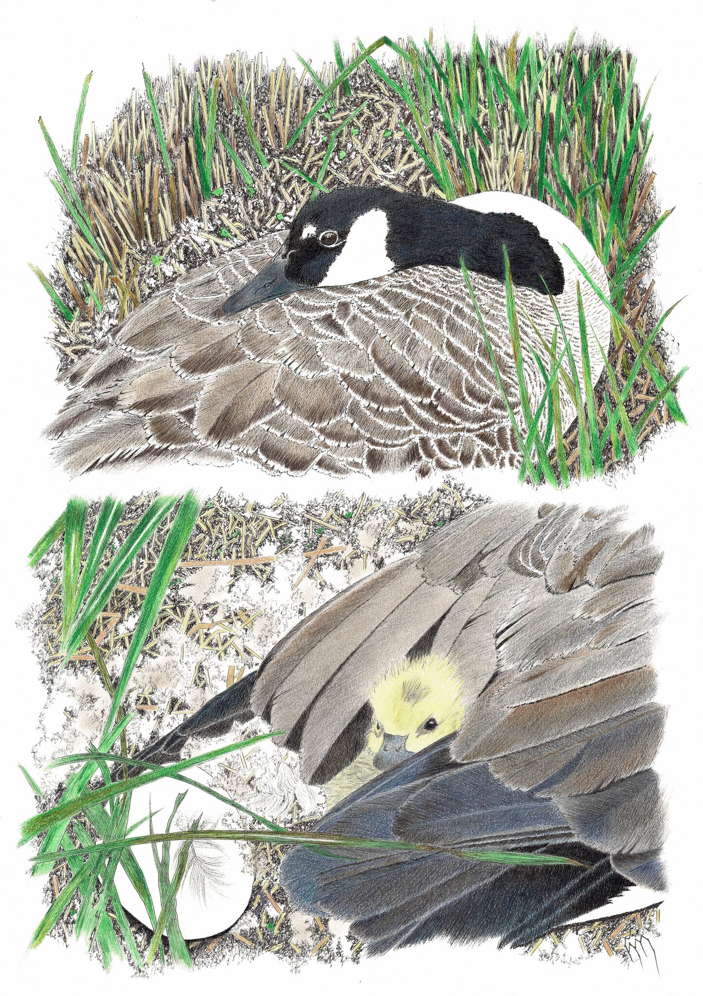 In het voorjaar van 2023 hoorde ik van Anja dat er een Canadese gans zat te broeden in haar achtertuin. Dat wilde ik heel graag van dicht(er)bij zelf zien! Uiteraard op respectvolle afstand om haar zo min mogelijk te storen. En wat een mooi plaatje trof ik aan, ze zat daar zo sereen en prachtig en trots op haar nest! Een kleine week later kreeg ik nog foto's van Anja doorgestuurd vanaf het eerste ei dat was uitgekomen. Deze foto van het eerste jong met de eierschaal er nog bij heb ik uitgekozen als uitgangsmateriaal voor deze pentekening, samen met moeder de gans. Referentiemateriaal via Anja Barendrecht