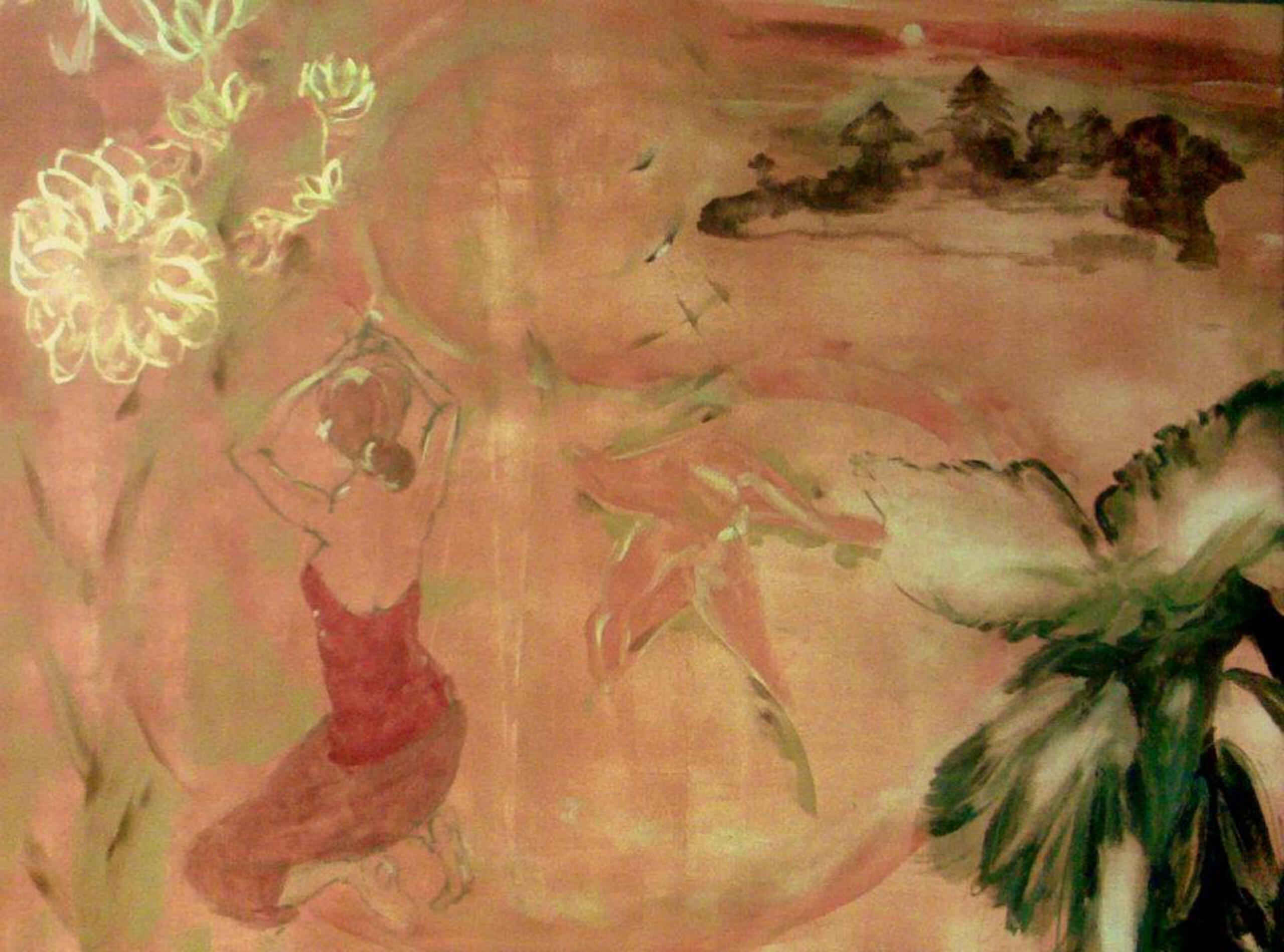 Mooi rustig schilderij, impressie Bali, met tekening vrouw, oranje , acryl op doek.