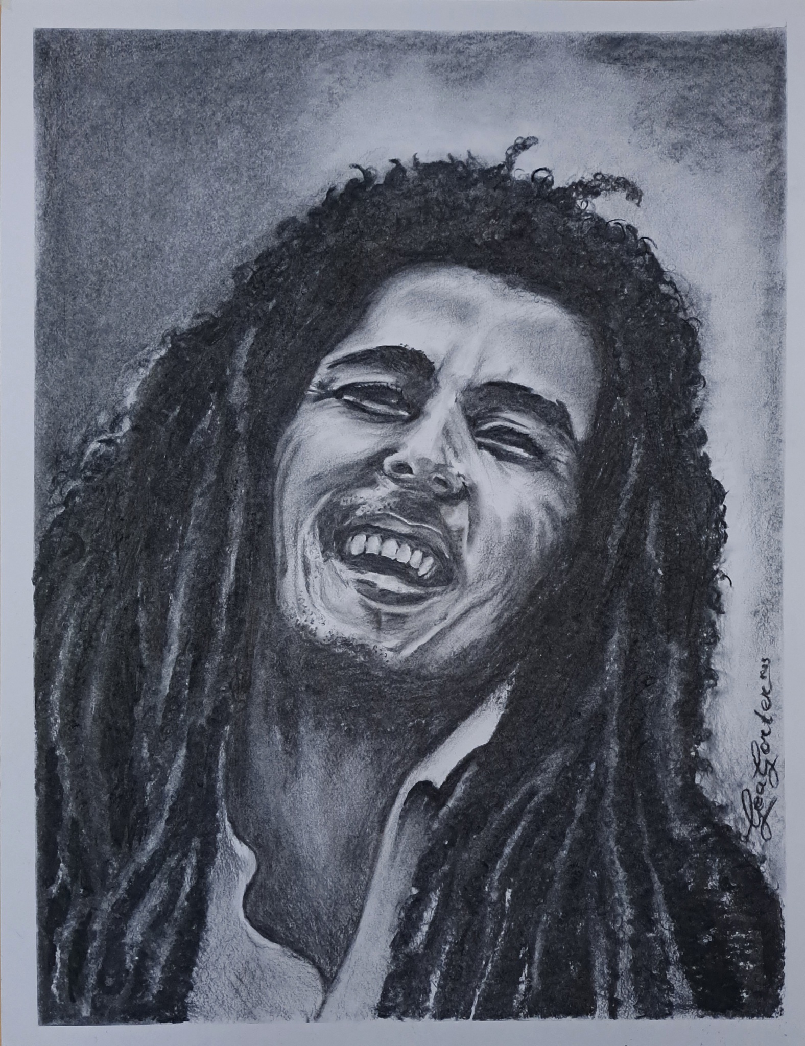 Bob Marley vind ik een mooie kop om te tekenen. Ik oefen veel met portretten om hier wat meer ervaring in te krijgen. Zo had ik in één keer zin om met houtskool te tekenen en de lessen die ik krijg uit te proberen. Dus met een bepaalde opbouw en uit losse hand. Leuk om te doen en tevreden over het resultaat!