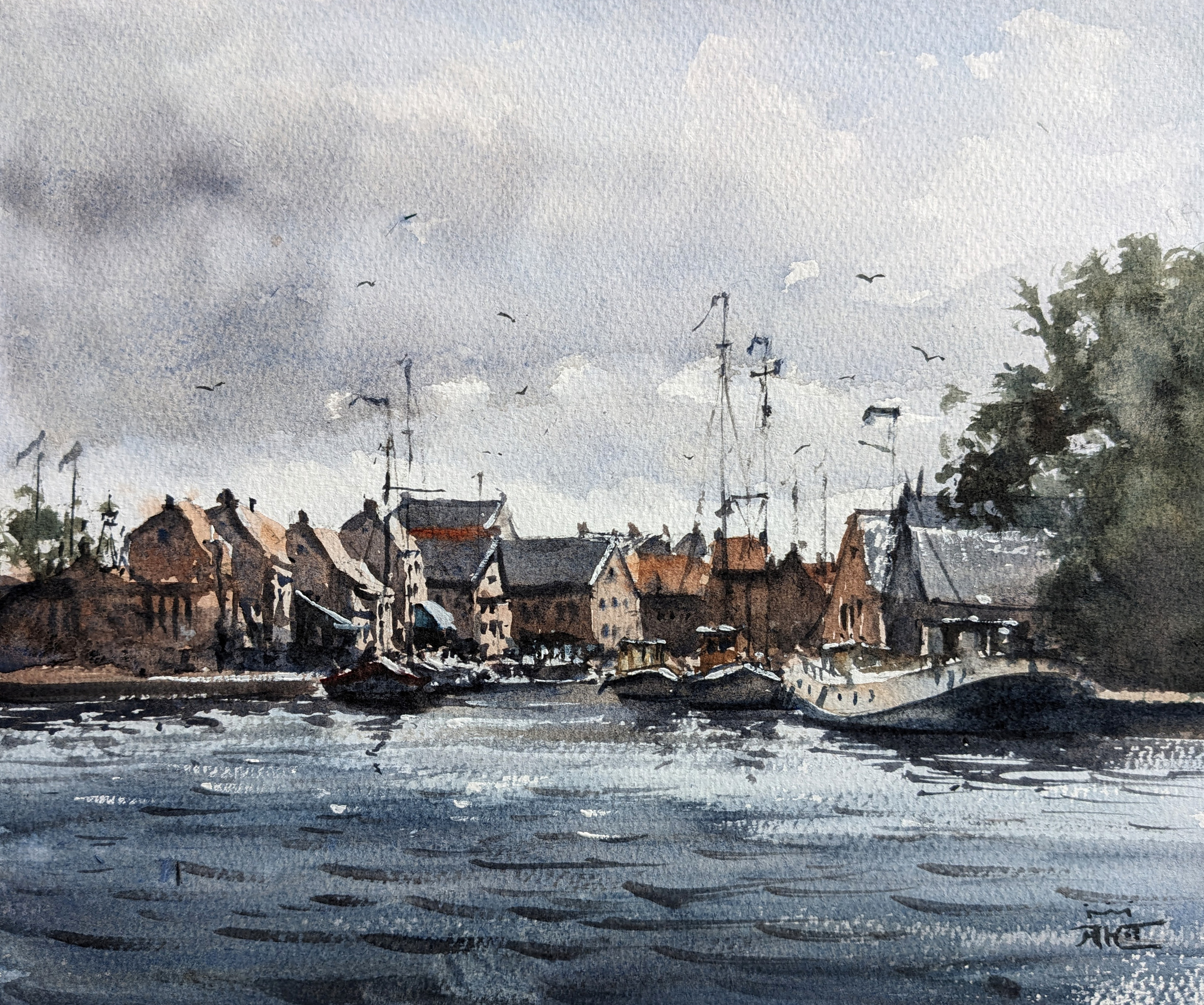Spakenburg Wolken Haven Bootjes Schepen Stadje Ijsselmeer Aquarel Impressionistisch "plein Air" Watercolor Impressionist Harbor Town Port Boats