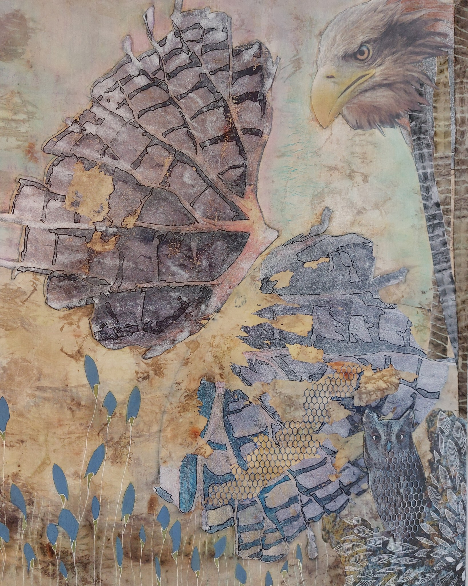 Fotografie in combinatie met ecoprint, pastel, acrylverf, inkt
