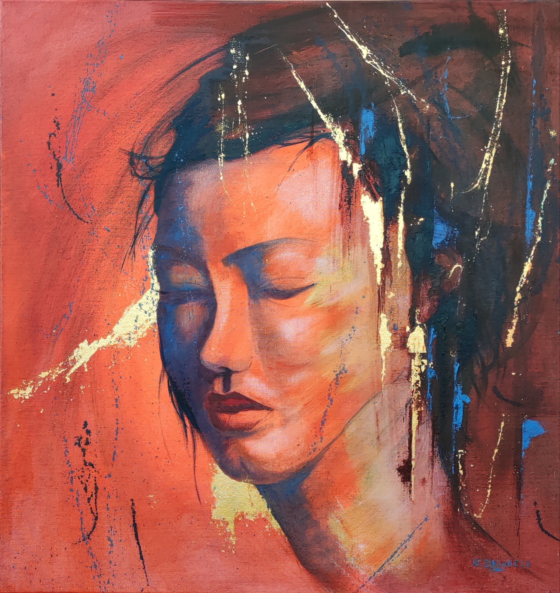 Het werk is geschilderd in hoogwaardige kleurvaste olieverf op linnen canvas en er is gebruik gemaakt van fragmenten bladgoud 22 kt. Het geheel is afgewerkt met een hoogwaardige vernislaag speciaal bedoeld voor schilderijen ter bescherming tegen vuil. The work is painted in high-quality, colourfast oil paint on linen canvas and fragments of 22 kt gold leaf have been used. The whole is finished with a high-quality varnish layer specially intended for paintings to protect against dirt.