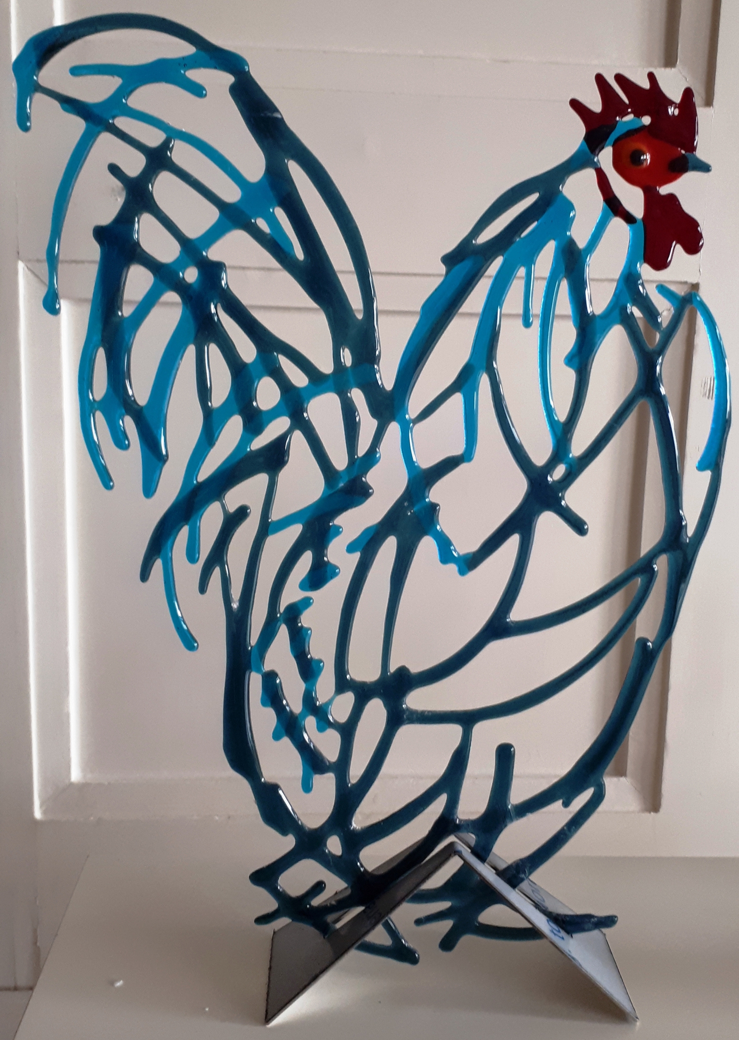 Rood Blauw Blue Glaskunst Red Haan Rooster Glasfusie Glassart Scheltema Bullseyeglass Louky Loukyscheltema Glasssfusion